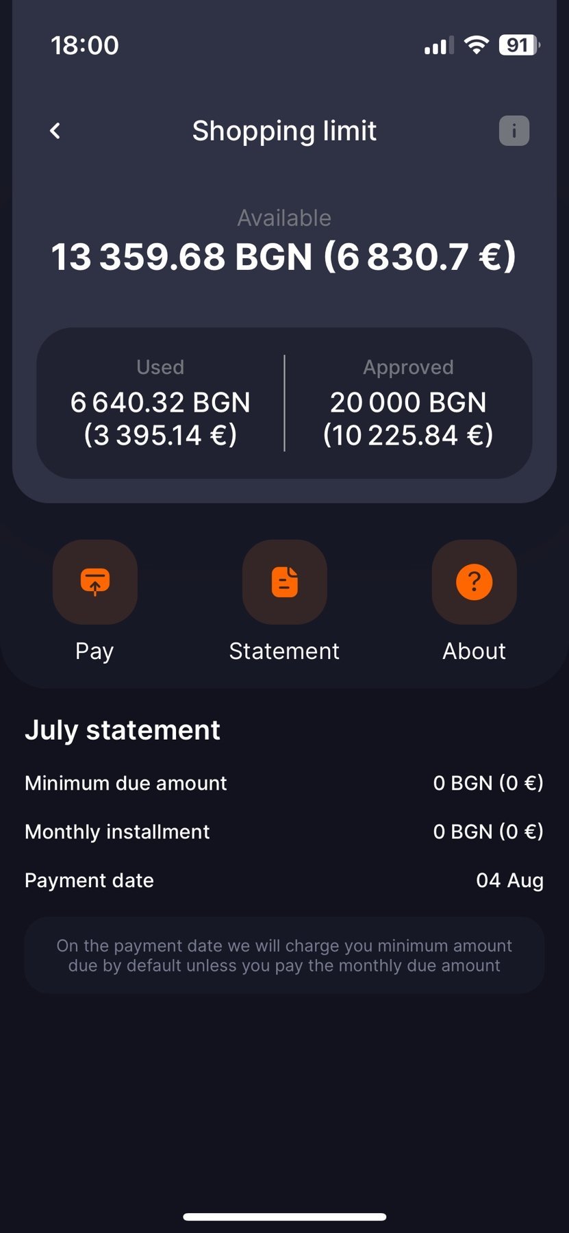 Шопинг лимитът на TBI Bank включва месечна такса от 1,5% при разсрочване за 6 или 12 месеца, докато разсрочването за 3 месеца е без такса. При теглене от лимита се начислява такса от 1 лв + 2% от сумата. Подобно на кредитирането, важно е да върнете сумата в рамките на 50 дни, за да не се начисляват лихви, които могат да достигнат до 30% годишно.