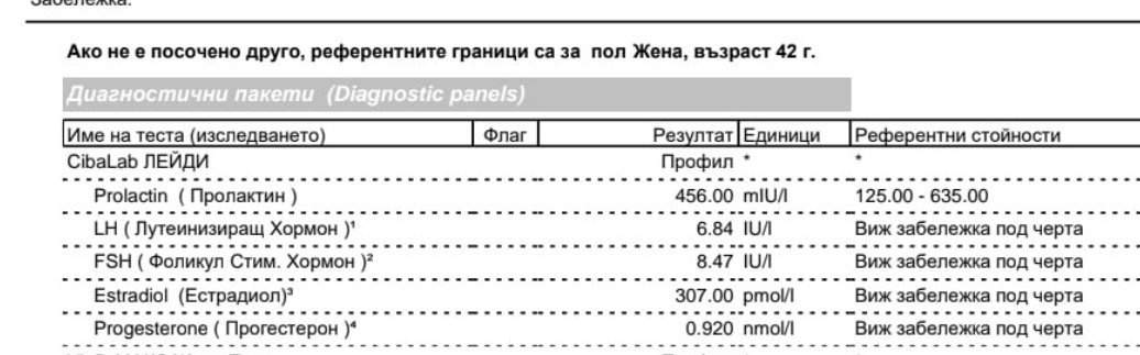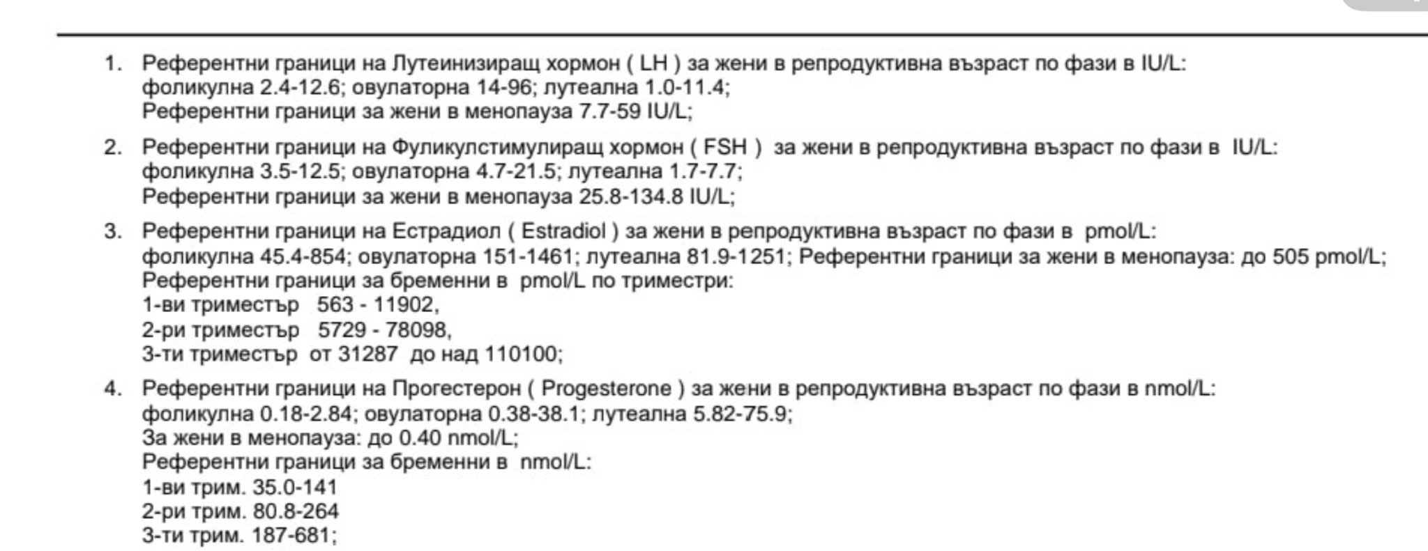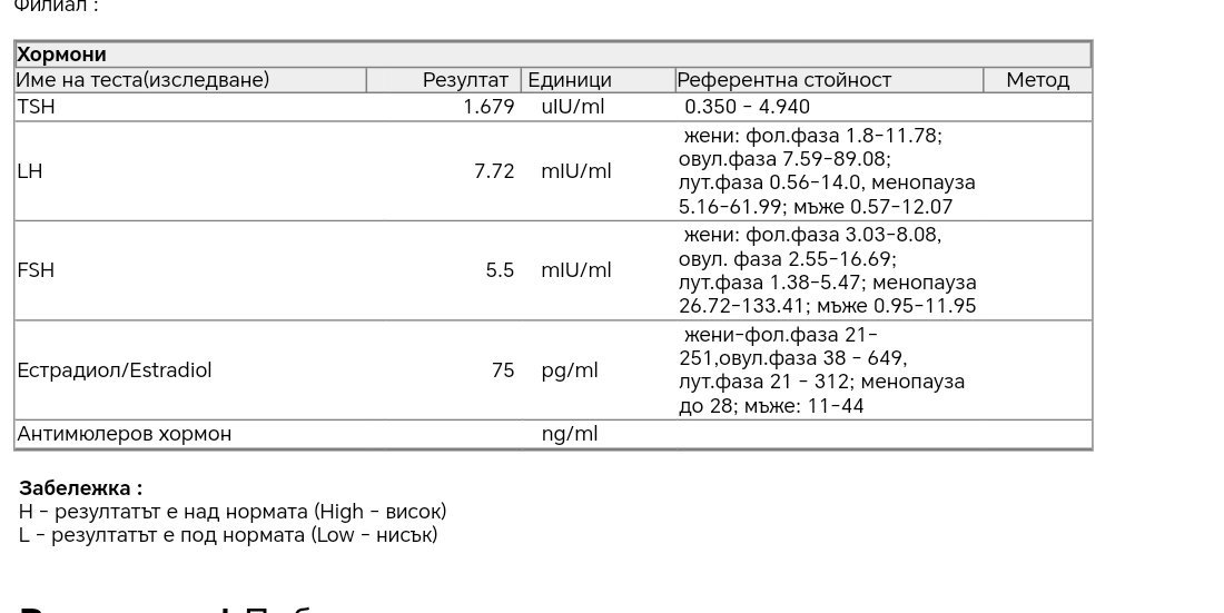 Аз съм в Англия и като ходих тук на лекар директно ми предложиха да слагам Мирена. Дори не ми пуснаха изследвания. Отказах. Бях си сега в БГ за една седмица и успях да си пусна профилактични кръвни, бях и на мамограф (докторът ми каза, че добре съм отказала Мирената засега). Чакам гинеколога ми в БГ да ми каже какво вижда, защото аз не съм проучвала и нищо не разбирам. На 5-ти ден от цикъла ги пуснах: