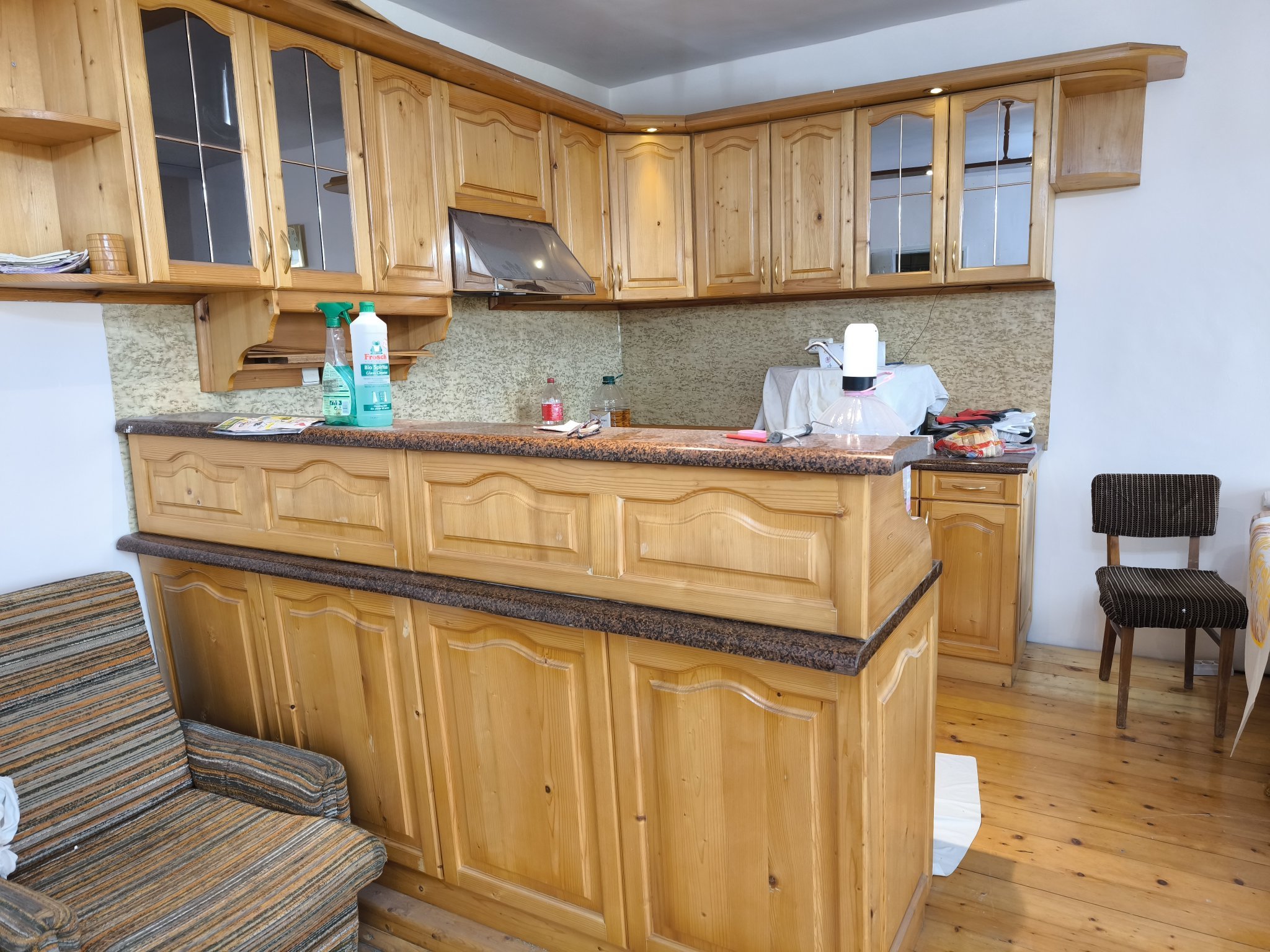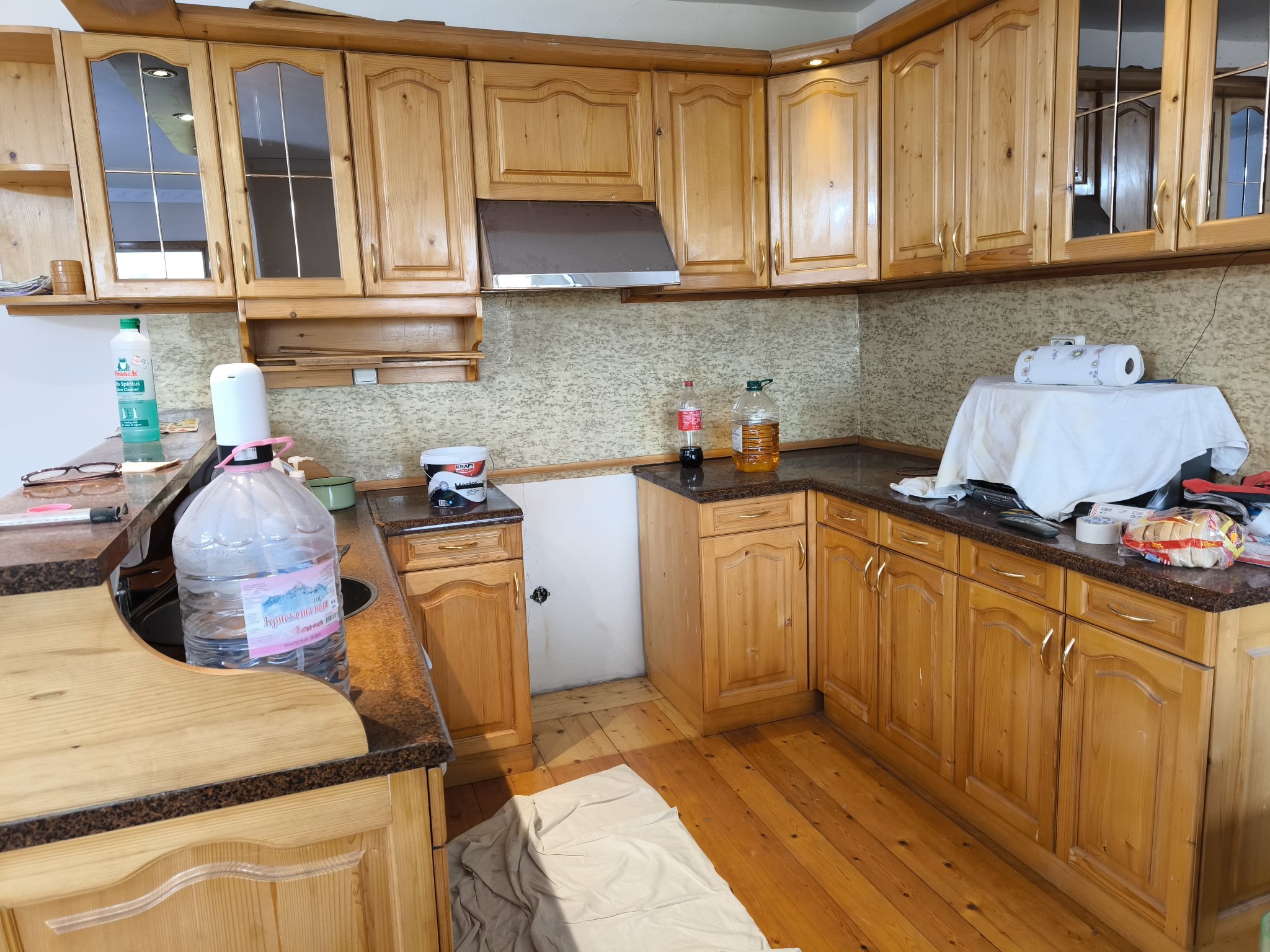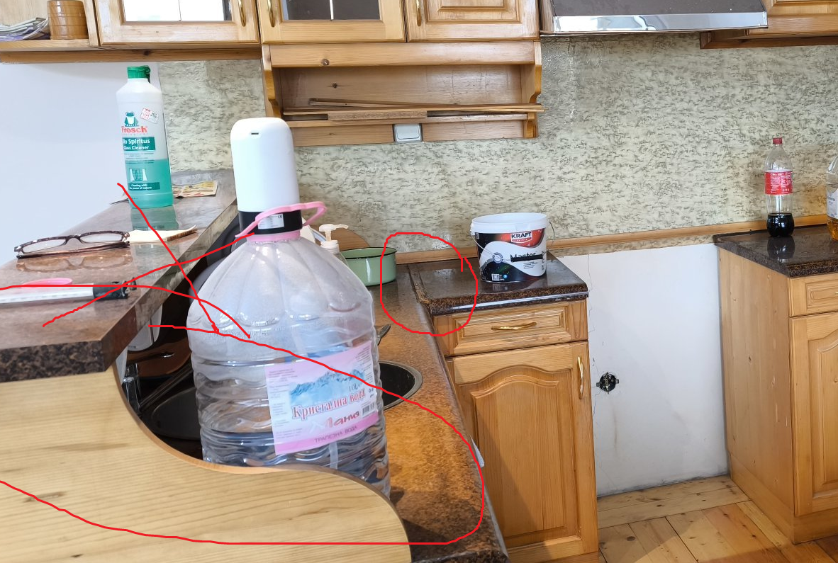 Ето аз как преобразих една кухня, също наследена от старите собственици. Трябваше ми временно решение, което да се реализира възможно най-бързо и евтино, за да влезем да живеем веднага, но резултатът взе, че доста ми хареса реших да ѝ дам още няколко годинки живот.
