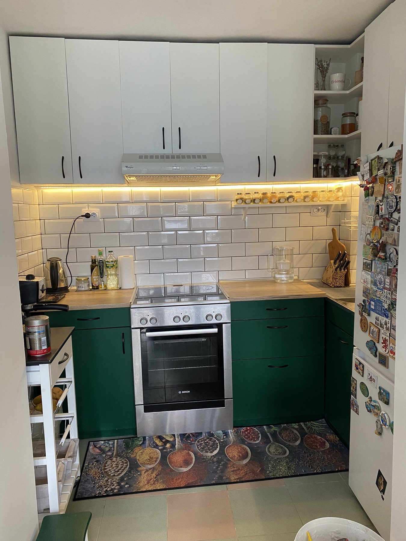 Понякога само едно старателно почистване върши чудеса. Нови дръжки по твой вкус и воала. Аз също бих махнала дъската с луничките, която продава твърде старомодно настроение, и бих залепила лед лента под горните шкафове, която да свети директно върху плота. И тези шкафчета без вратички също бих разкарала. Изглеждат като допълнително слагани и развалят линията. Бих сменила и стъклата на витрините - да не са огледални като от евтина кръчма.