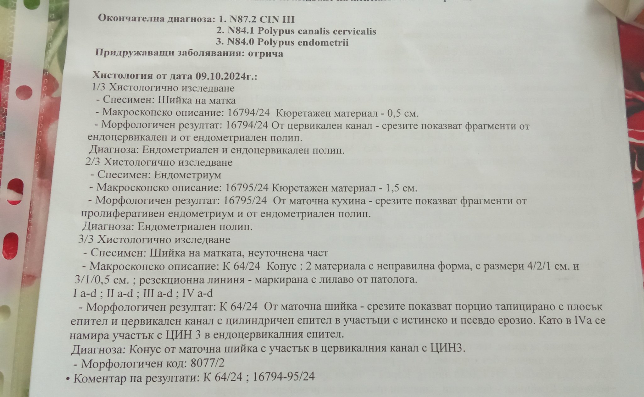 Питате гинеколога точно да ви обясни какво значи това “маркирано в лилаво” или звъните там, където е правена хистопатологията.