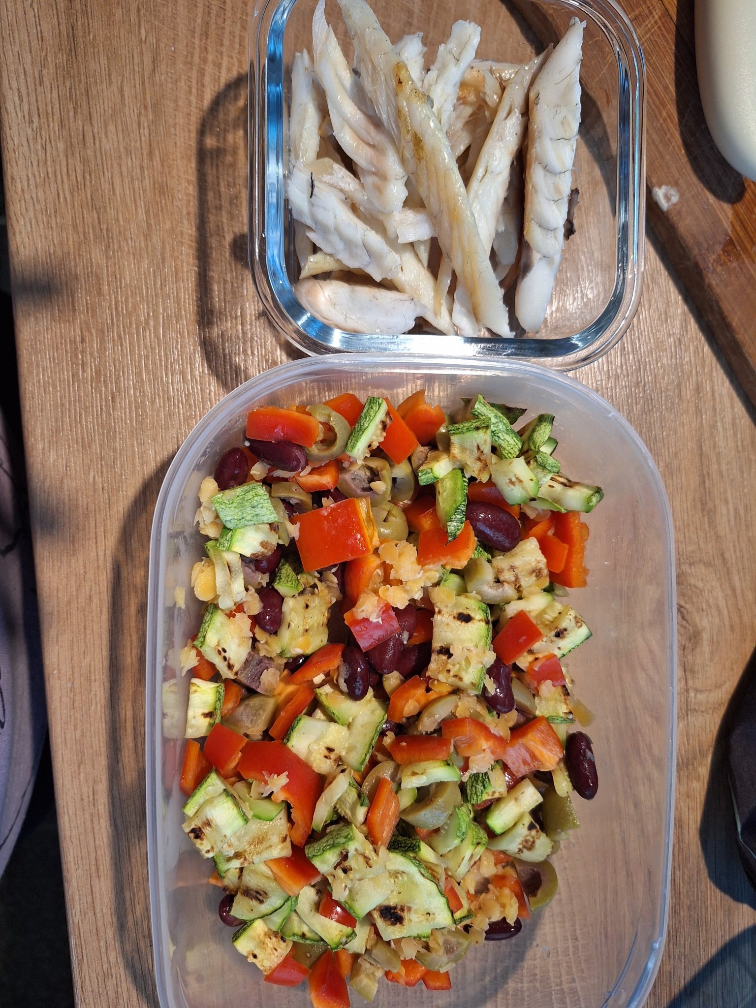 Обяд-110 г лаврак печен, салата от 15 г червена леща, 50 г червен боб, една малка червена чушка, 33 г маслини и 360 г тиквичка на грил тиган.