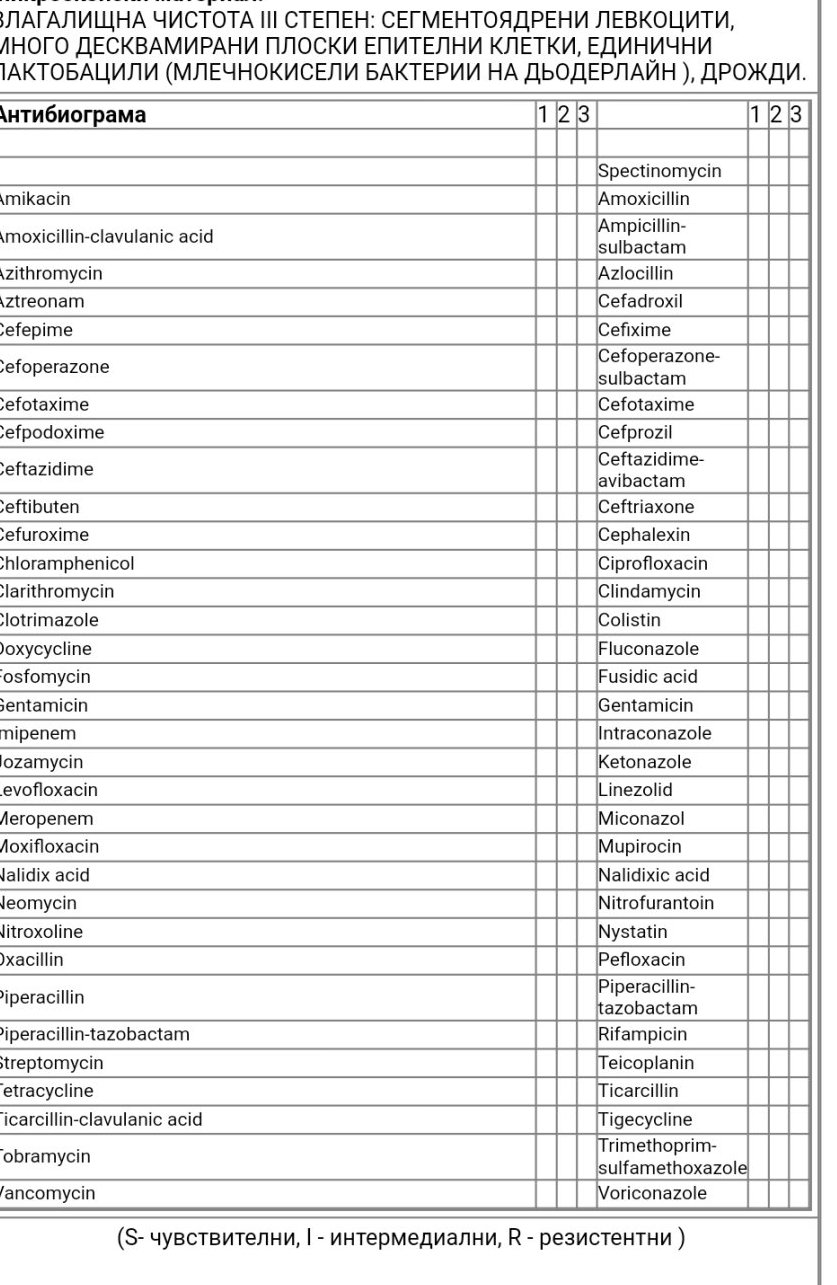 Отстрани не се вижда хубаво .. но като гледам няма изолирана бактерия.  Влагалищна чистота 3та степен - имате липса на лактобацили.