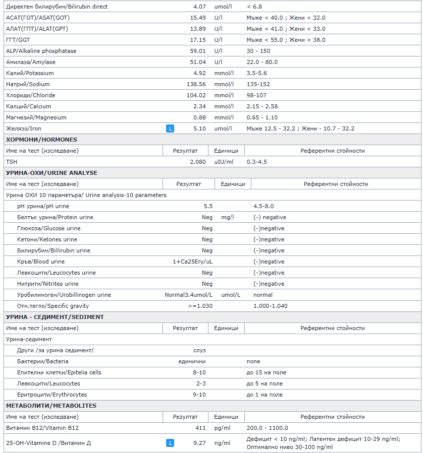 В добавка - има 9-10 Еритроцита в урината (при норма до 1 на поле), както и желязото е 5.10 umol/l при реф. граници 10.7 - 32.2.
