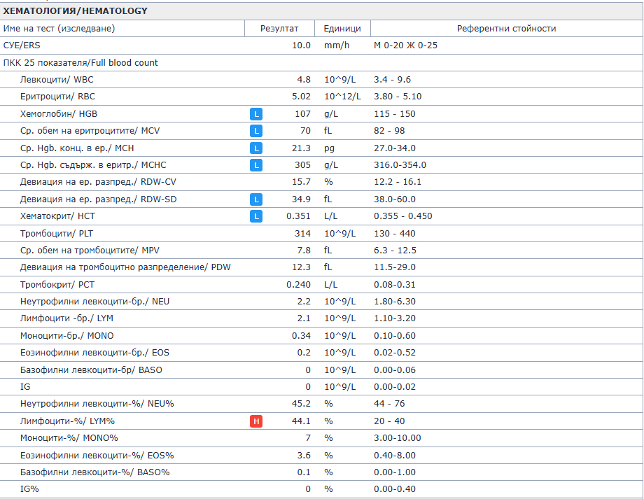 Здравейте! Бих била много признателна, ако някой с познания в областта погледне резултатите ми и ме насочи към правилния тип специалист. Вчера ми се обадиха от кръвен център с молба да даря кръв (редовен кръводарител съм, последно дарявах преди 3 месеца) и когато отидох на теста преди да ми вземат кръвта излезе, че хемоглобинът ми е твърде нисък за кръводаряване. Лекарката ме посъветва да направя изследвания при първа възможност, защото обикновено ми е висок (130-135). Тази сутрин пуснах и пълна кръвна картина + урина + пакет витамини (някои още не са излезли). Резултатите са: