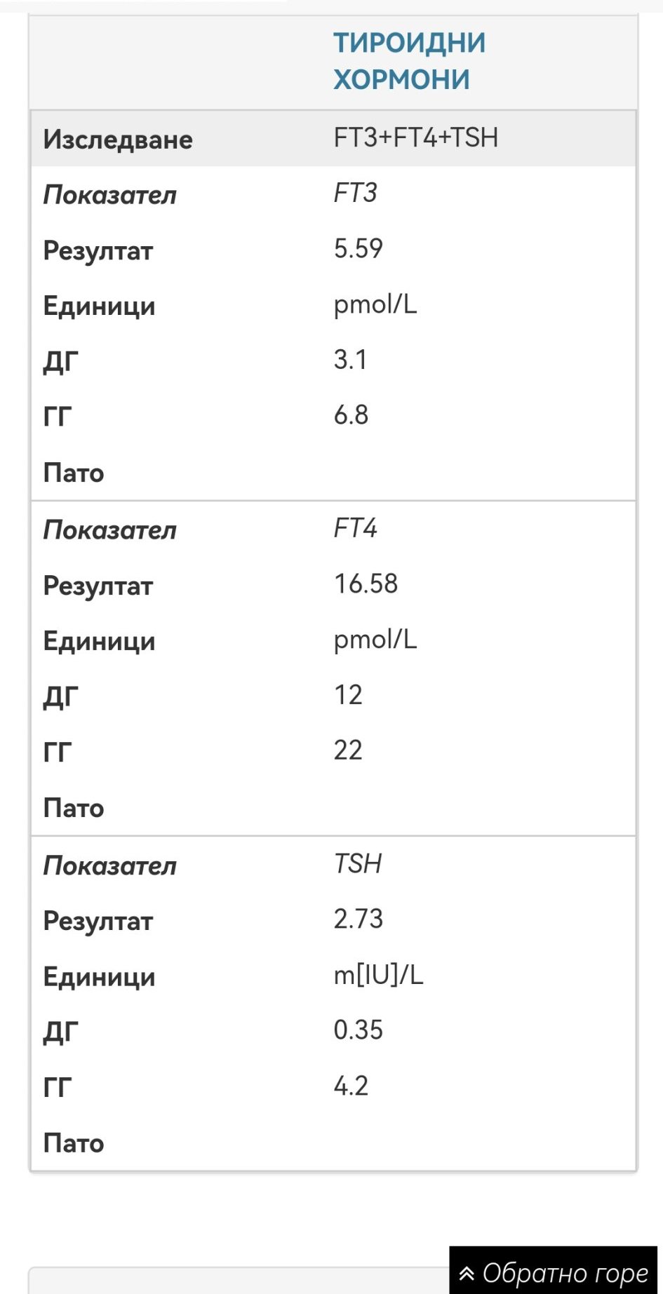 Милена Живкова 770741 според мен щитовидните са добре, но смятам, че имаш ИР. Вит.Д ти е нисък, както и фолата и В12, вероятно затова хомоцистеина ти е почти на горна граница. Андрогените също са високи виждаш си ги.
