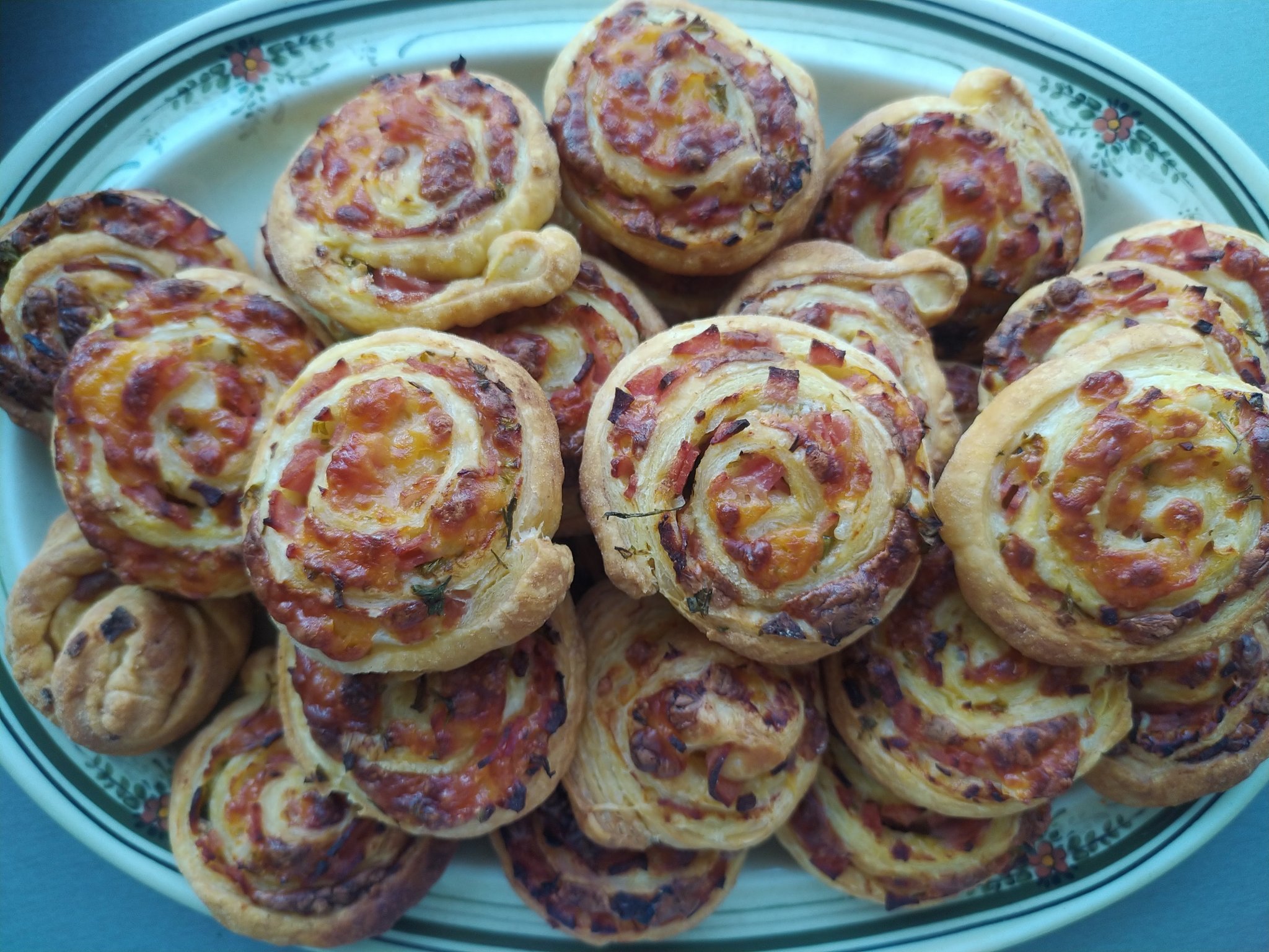 С бутер тесто обичам да правя охлювчета за закуска, става лесно и бързо. Разстилам кората тесто, намазвам с крема сирене и поръсвам с нарязана шунка, кашкавал, маслини.. каквото имам в хладилника. 🤭 Завивам на руло и режа с остър нож на парчета. Нареждам охлювчетата в тава с хартия за печене и пека в предварително загрята фурна до готовност.