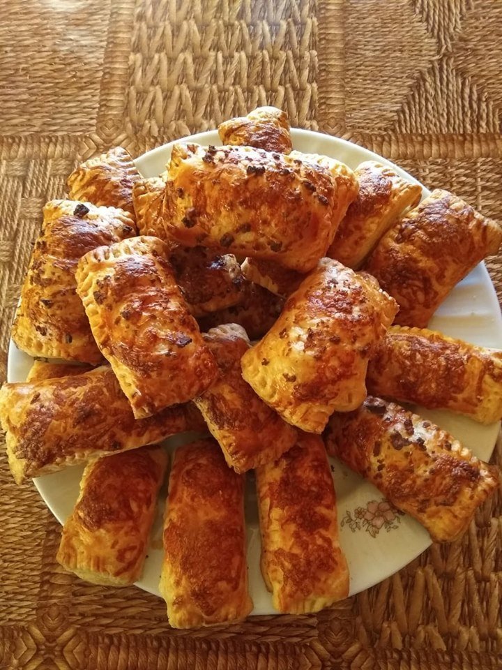 От бутер тестото се изрязват правоъгълници. На едната им дълга половина се редят нарязани на ивички колбас, кашкавал и зеленчуци по избор. Всичко се поръсва с чубрица, риган и малко кетчуп, за да не се разводни тестото. Захлупват се с другата половина и хубаво се притискат. Отгоре се намазват с яйце и се поръсват със сусам и маково семе. Пекат се в силно загрята фурна.