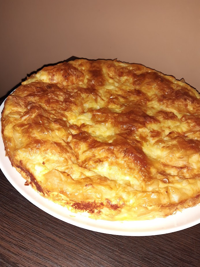 5-6 яйца, 1 чаша 250 мл кисело мляко с угасена в нея лъжичка сода, 200 гр натрошено сирене, 100 мл. газирана вода. Редят се точените кори в намаслена тава, ред кори, ред плънка като се наръсва с олио. Накрая се завършва с кисело мляко и яйце. Пече се на 200 гр. до готовност.