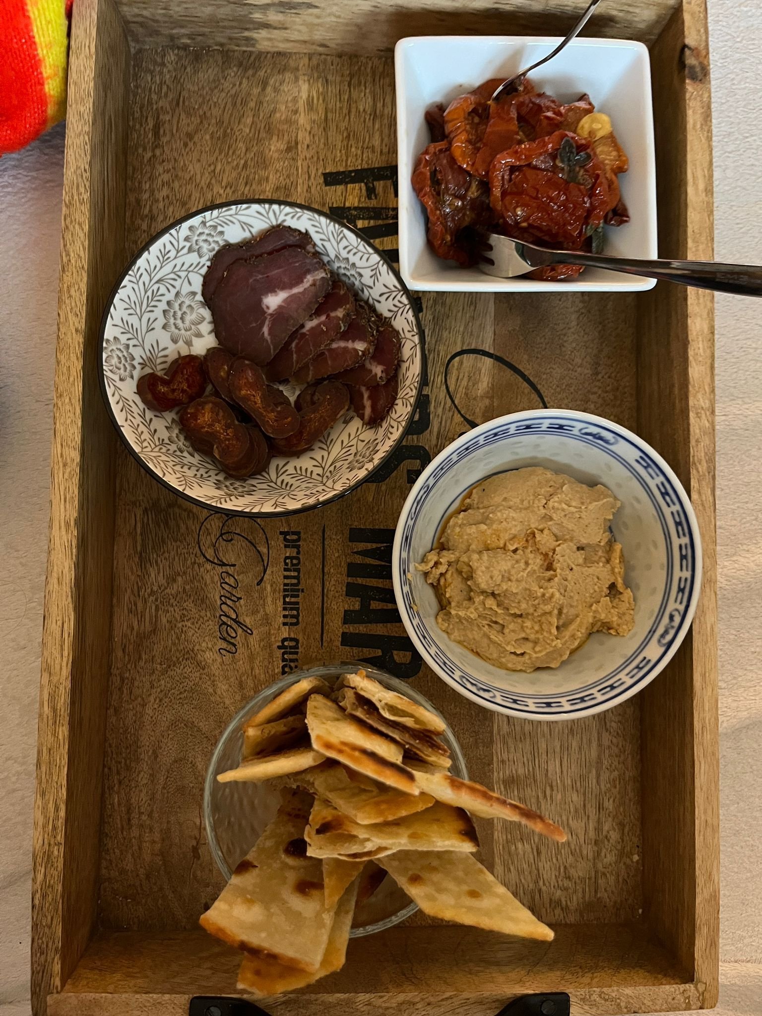 Хумус,домашни сушени домати и мезета.