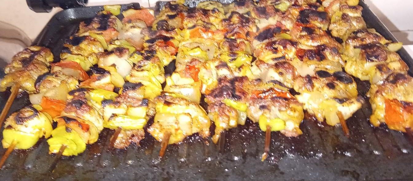 Шишове със свинско месо и сланина, лук, чушка и домат, мариновани