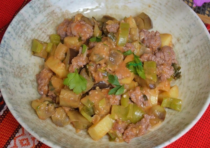 Пържен патладжан с кайма и картофи