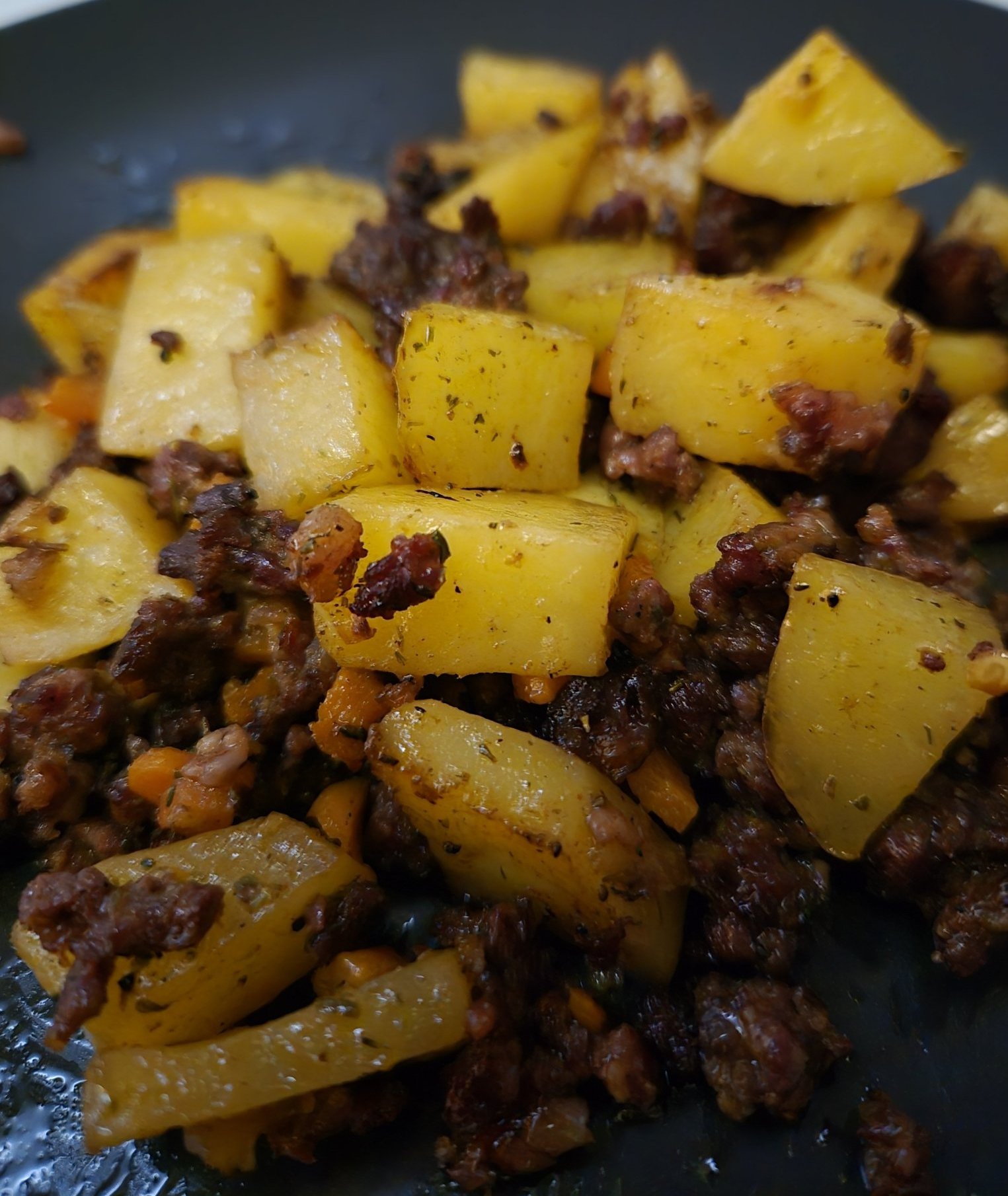 Мусака с конска кайма. Изключително наситен, мазничък и плътен вкус.
