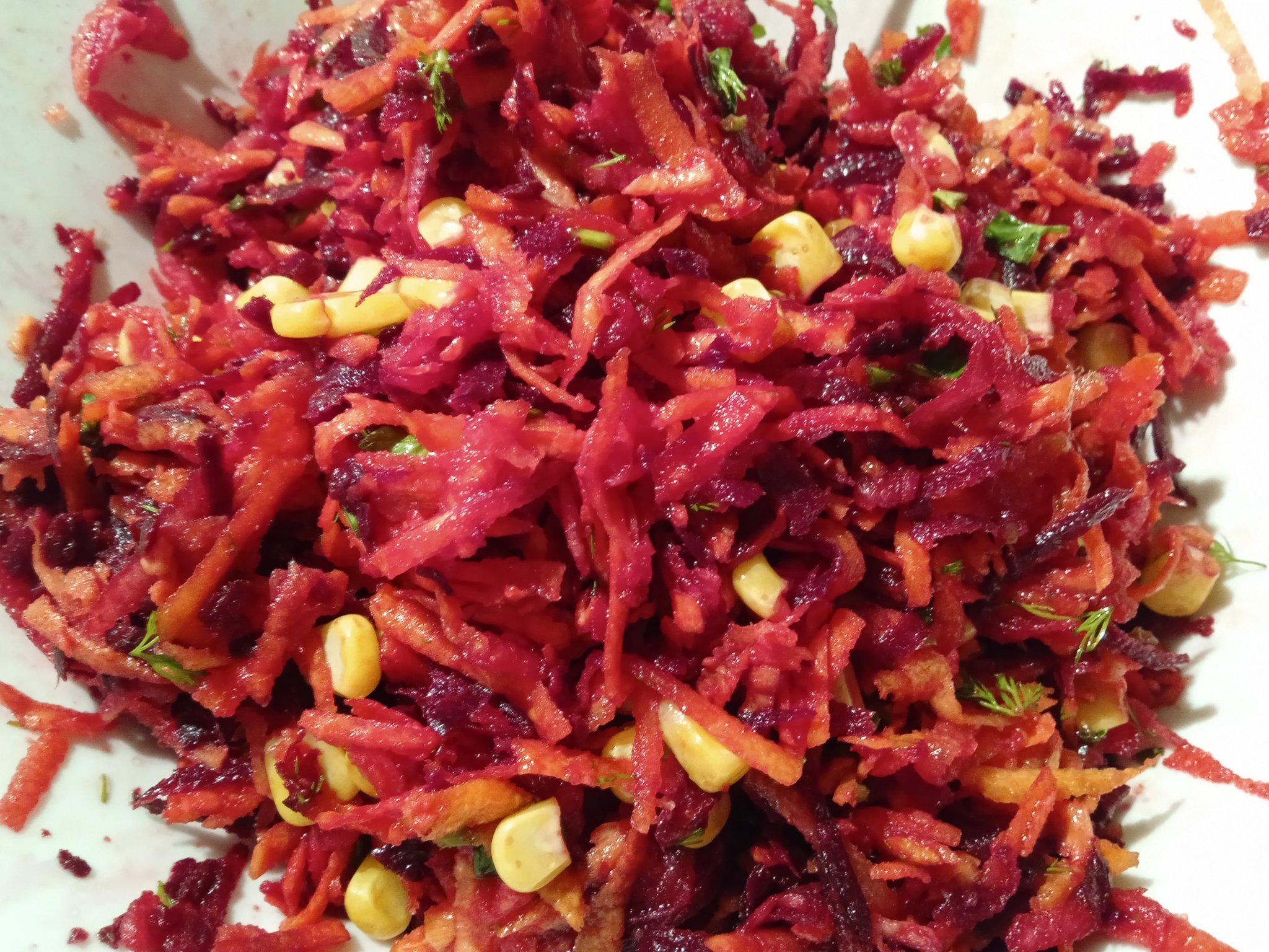 Салата от панджар,морков,ябълка,царевица, лимон и магданоз