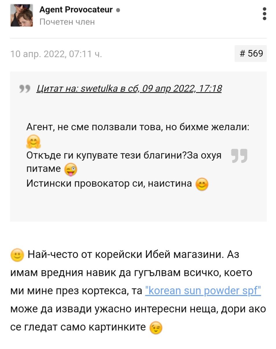 Купувам от Ибей от корейски търговци. Преди около година обаче намерих една корейка, която живее в САЩ (и аз съм тук), която има бизнес с корейски продукти и тестери, цените и са много добри, изпраща веднага и за капак пакетчетата пристигат при мен за 2 дни. Малко е серт, но като я тормозя с въпроси ми дава честни отговори без да цели да ми продаде нещо ненужно, дори ми дава малък дискаунт понякога. Ако нужният ми продукт го има предпочитам да си го купя от нея, зарежда бързо новите неща. И не само аз съм доволната, съдейки от рейтинга и. Сек да я скрийншотна...