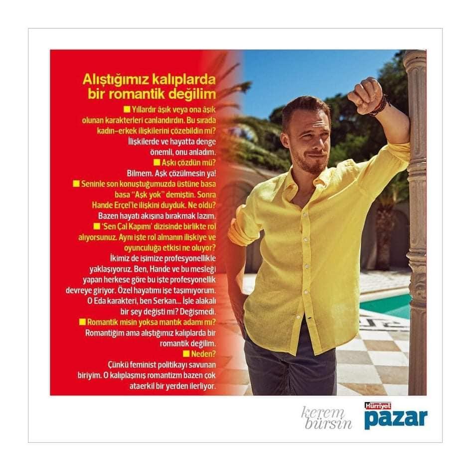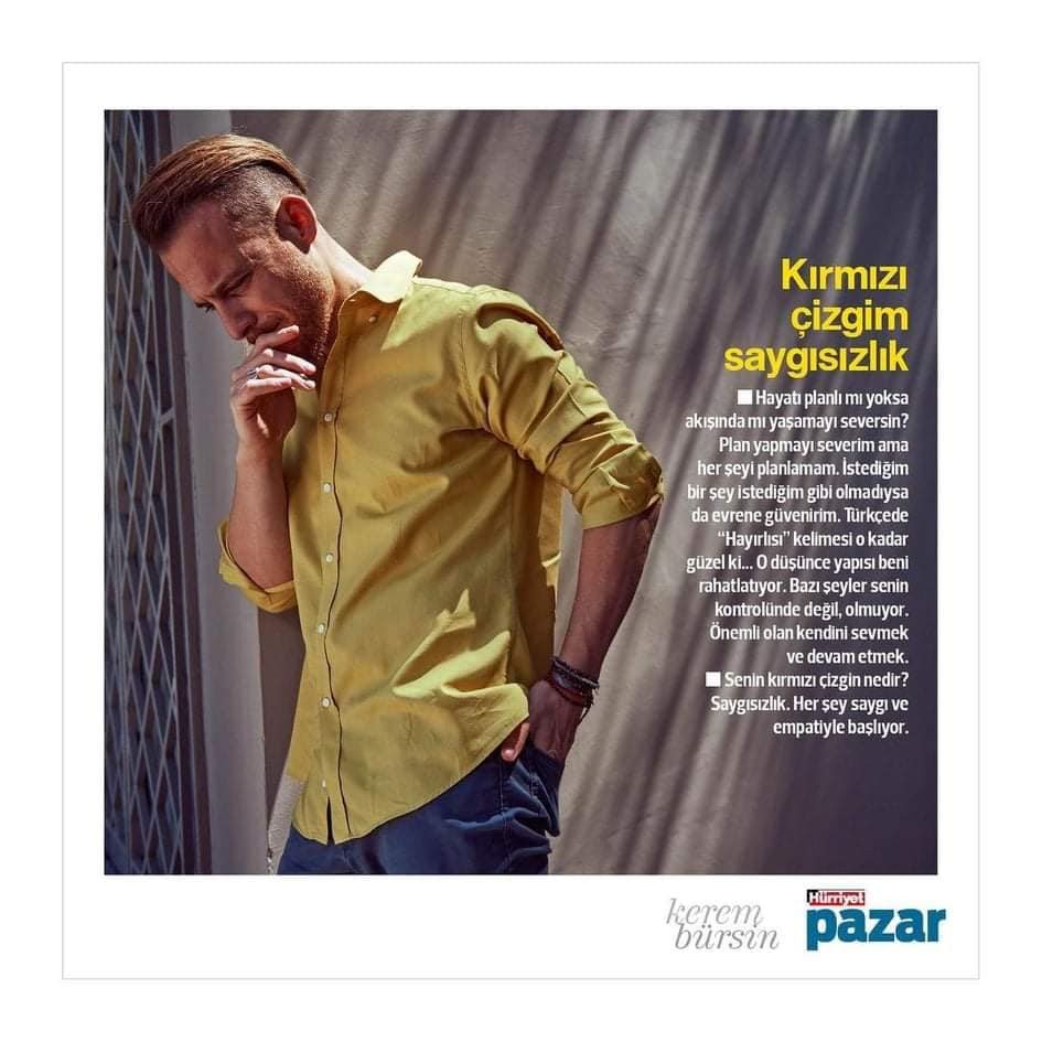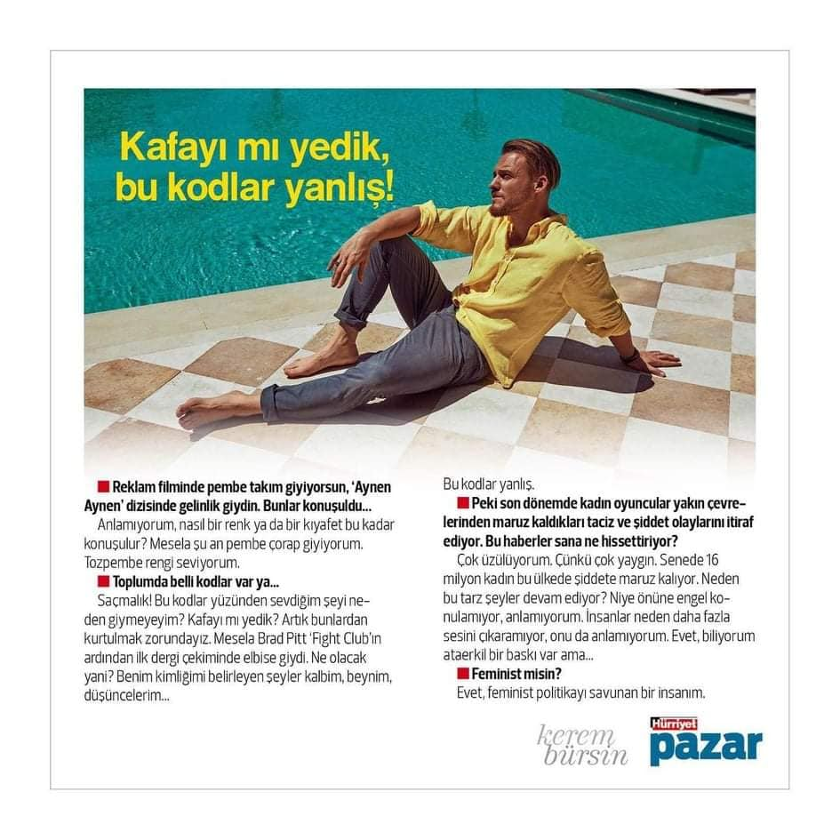 Преди осем години той влезе в живота ни и непрекъснато напредва в актьорската си кариера.  Той не се колебае да се опита в различни области, от драма до комедия, в допълнение към професионалния си успех, той говори за правата на жените, защитава феминистката политика и разсъждава върху световните проблеми.  Срещнахме се с Керем Бюрсин, който през лятото участва в два телевизионни сериала и в реклама, и говорихме за нови проекти, живот и любов: „Не мисля, че съм секси. Не виждам себе си по този начин и не искам да се виждам по този начин. Глупост!"