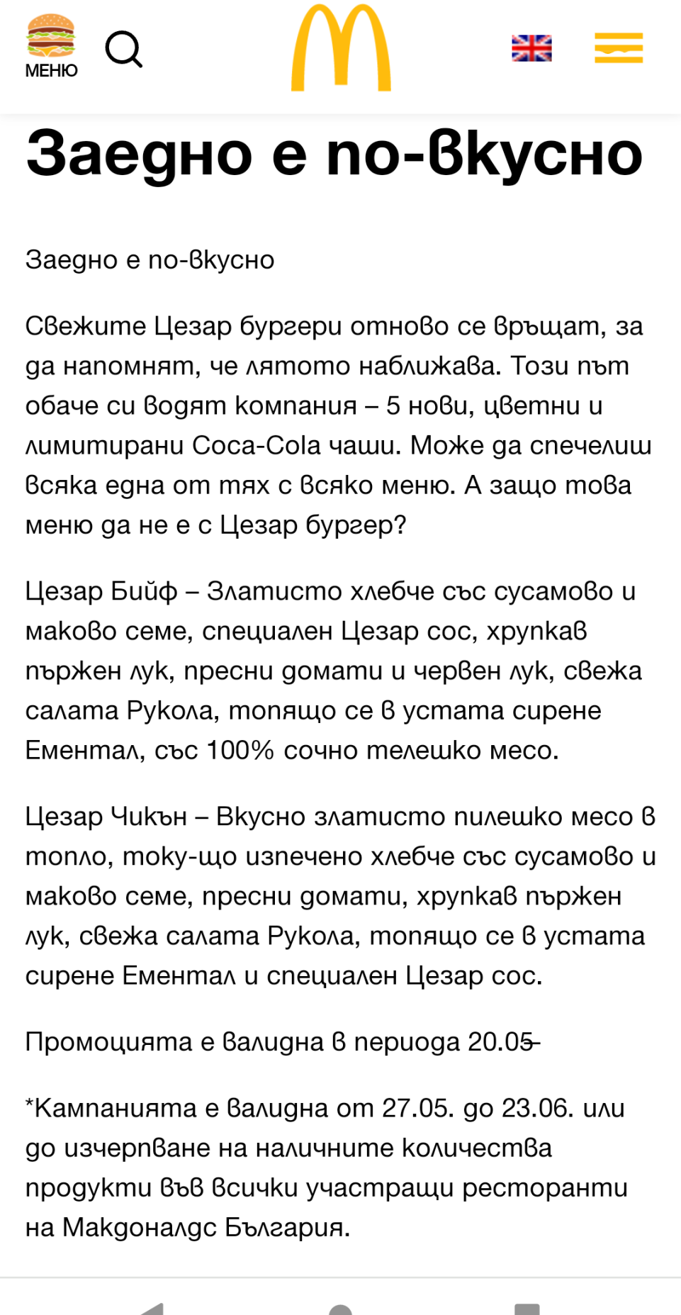 А, намерих го. Значи чашите са само с Цезар Бийф/чикън меню доколкото разбирам. Явно още не са наясно навсякъде. Нова е промоцията.