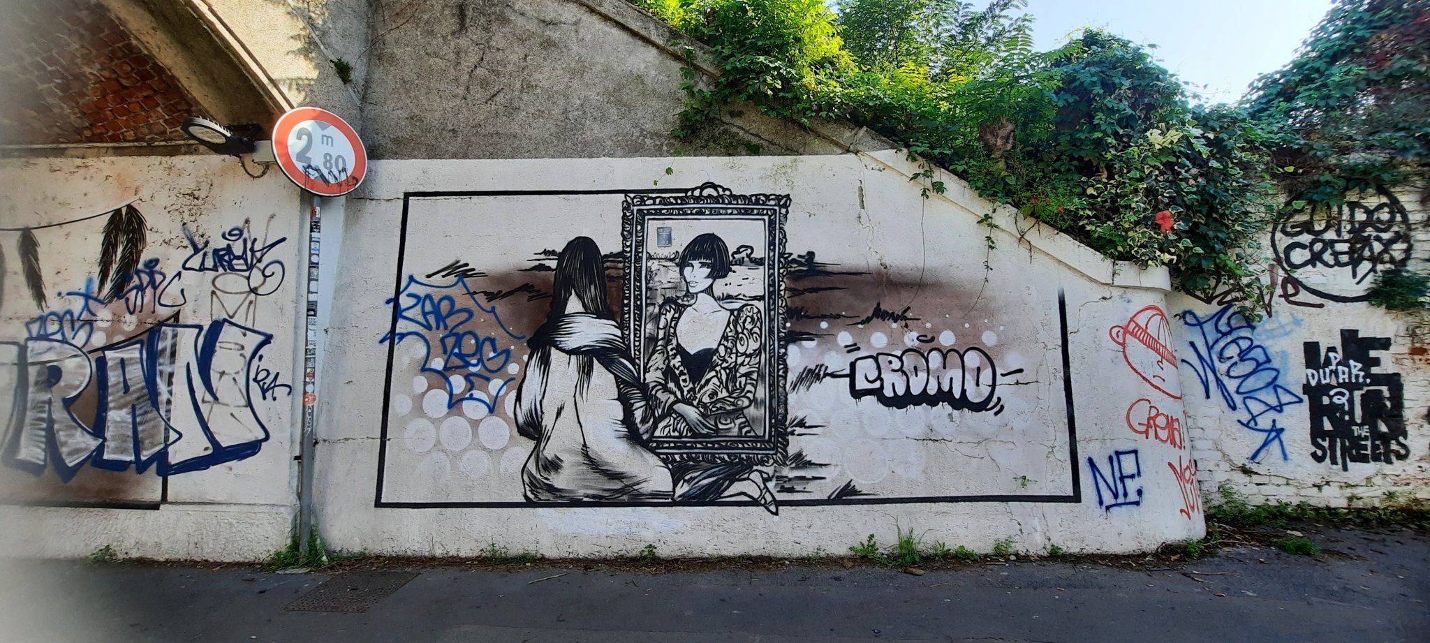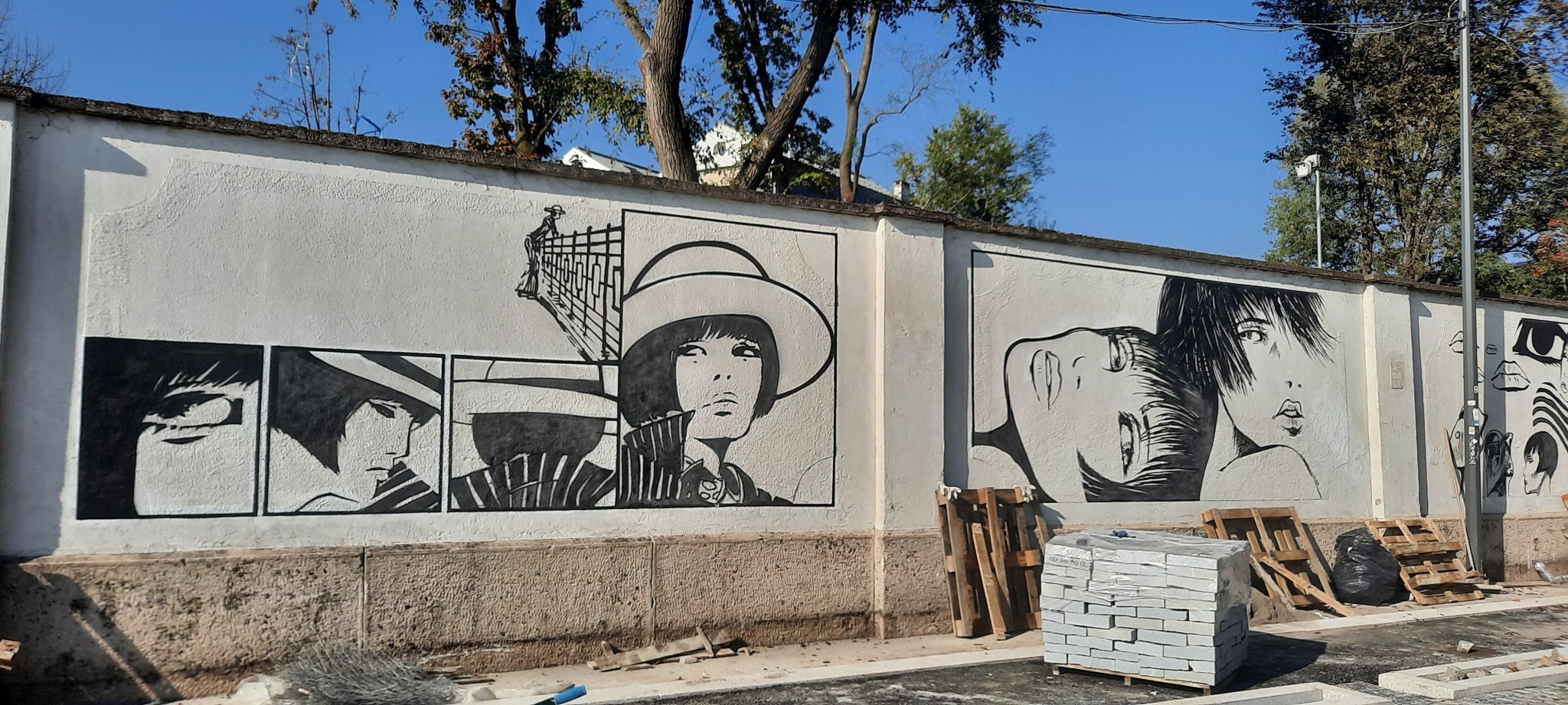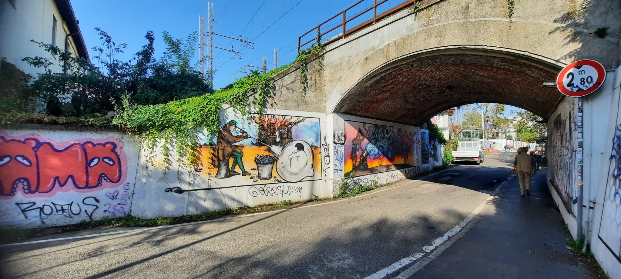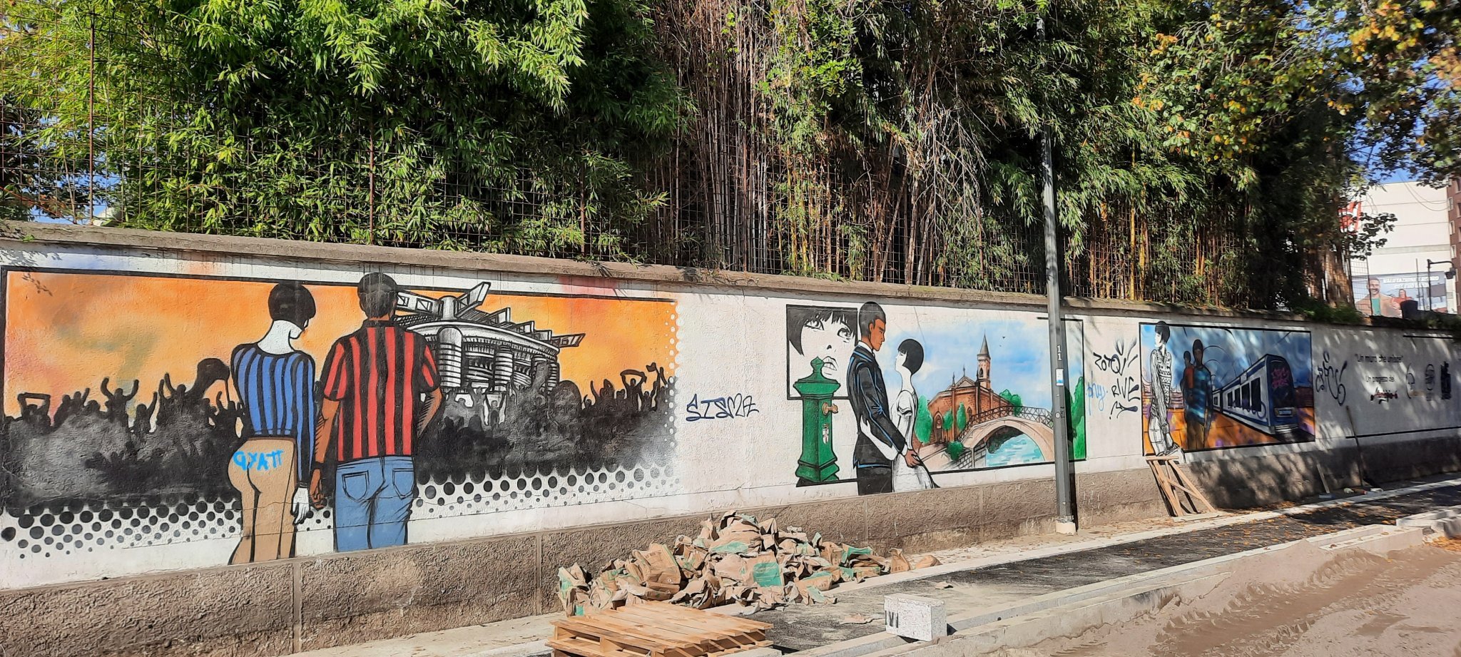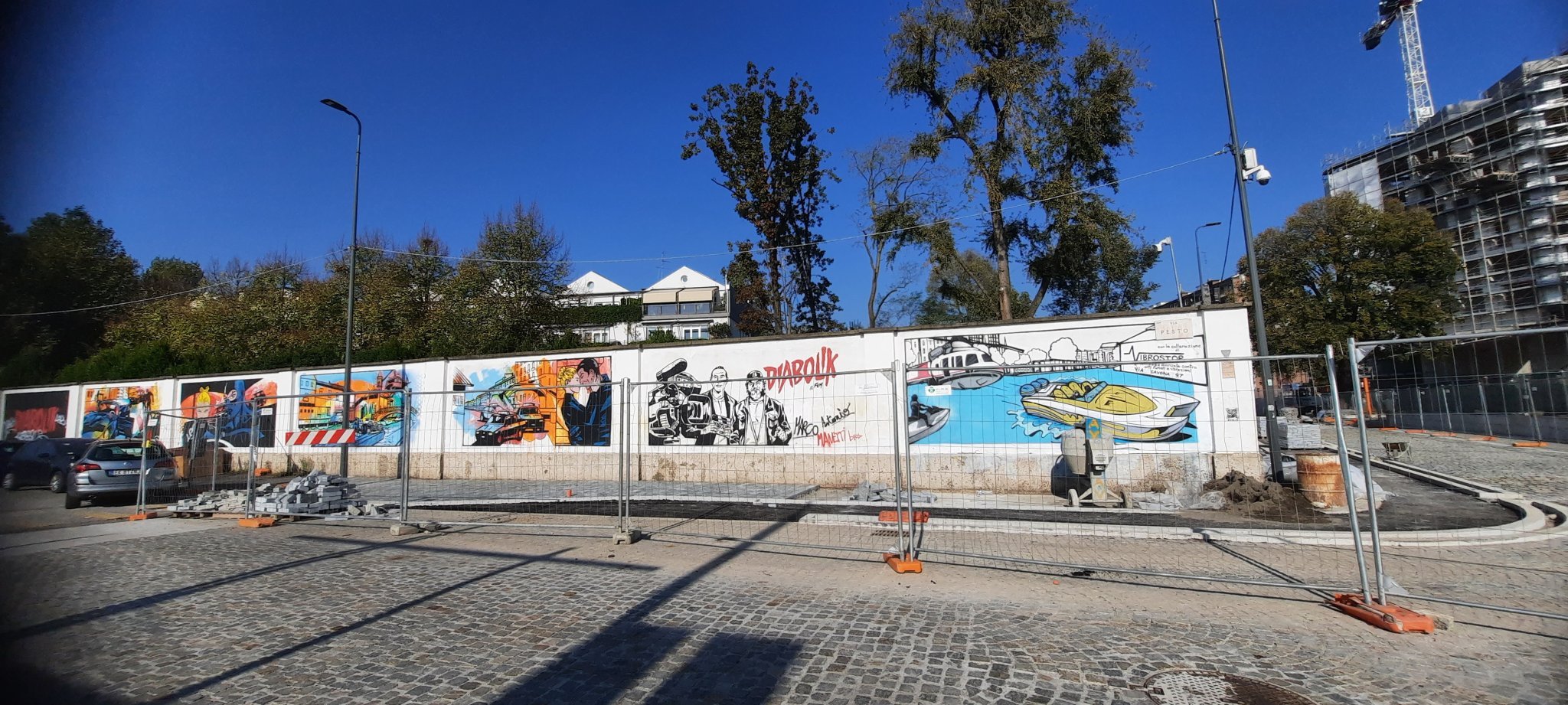 Отзад има различни муралес (за съжаление точно тогава ремонтираха улицата и се виждат ограждения и строителни материали):