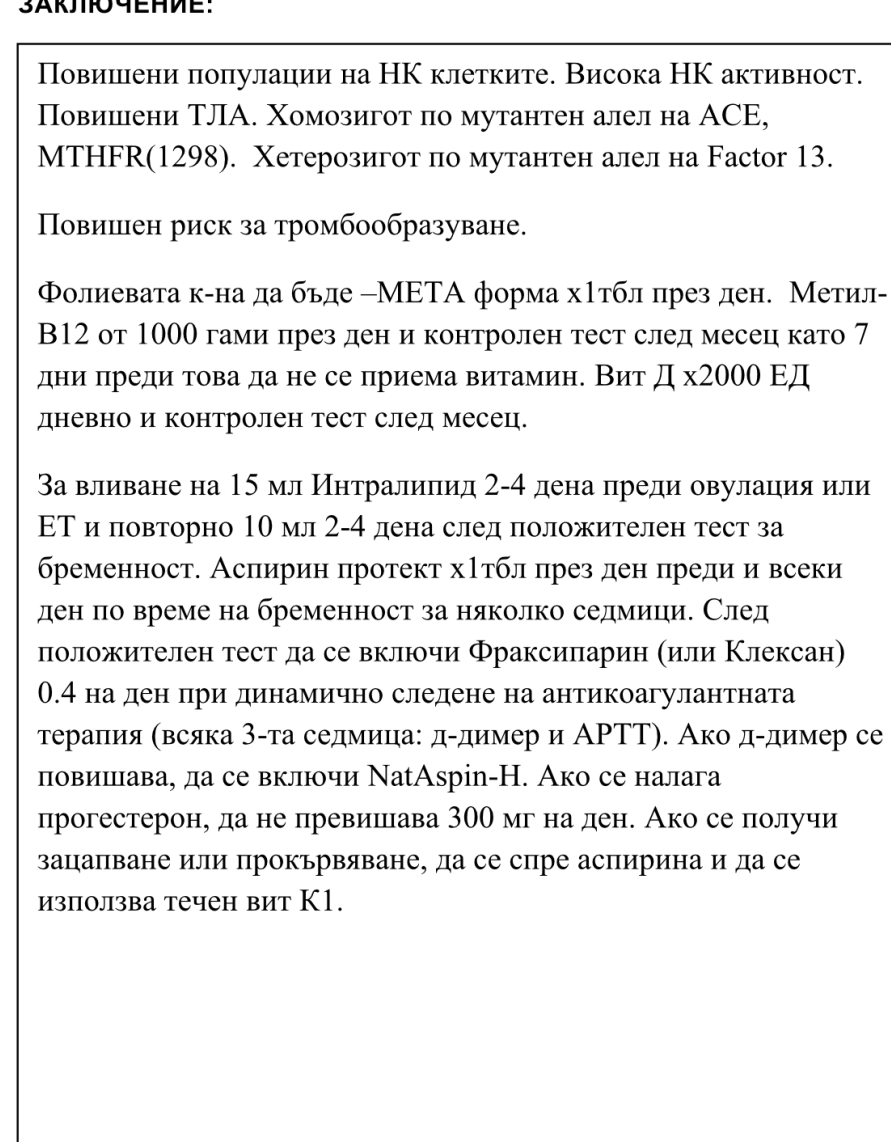 Съни, Терапията на Русев е съвсем адекватна на база изследванията, които сте направили, и са много адекватни преди и по време на бременност. Но от изследваните неща единствено ниския вит Д може да е конкретна причина за ниско качество на яйцеклетките и оттам - генетични аномалии. При повтарящи се генетични аномалии, напреднала възраст и/или проблеми в спермограмата и днк фрагментации най-доброто е инвитро с ПИД.