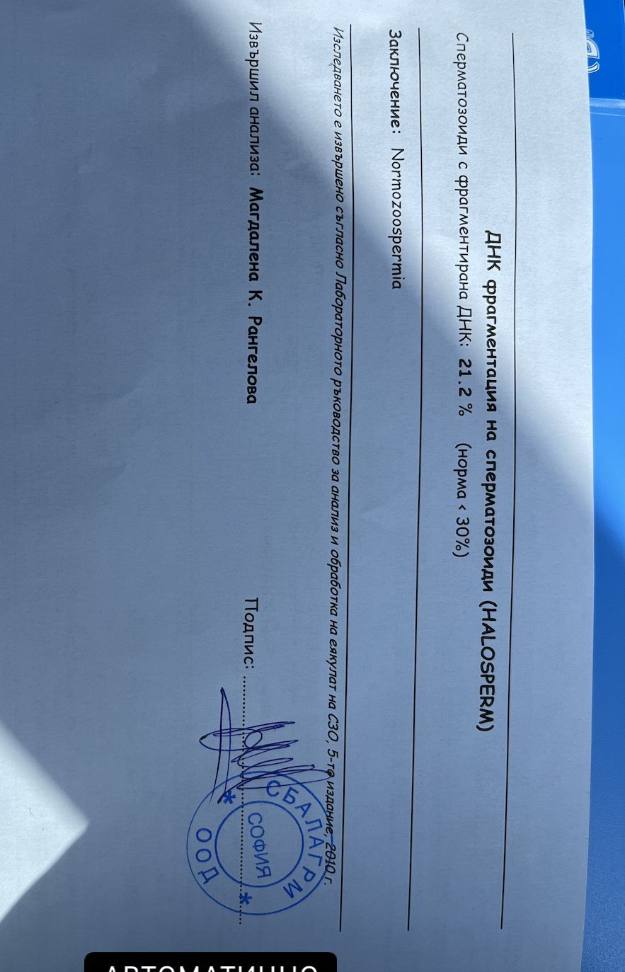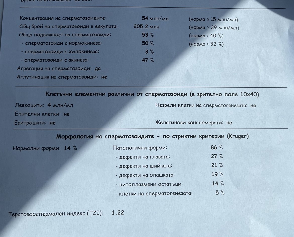 Сега пак погледнах изследванията и съм объркала процента ни е 21%. Правихме консултация с андролог, който каза че били перфектни нямало нужда от нищо. А Русев ми каза, че е заложен голям процент(30) и би трябвало да е 15.