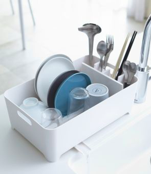 Аз от доста време нямам такъв отцедник нито на плота, нито в шкафа и доста място ми се освободи. Рядко мия на ръка, но като ми се наложи без отцедник свикнах след измиването да подсушавам бързичко и прибирам. Но има доста интересни и компактни предложения вече. Щом не миете много,мисля,че нямате нужда от отцедник на два реда за 4 чинии и 2 чаши. Намерих нещо като кутия и в него ги нареждате,но малко ми изглежда трудно почистването,въпреки,че има чучурче и ще се оттича водата. Може би вътре под чиниите някакво микрофибърно парцалче да сложите и то да си попива. Има и някакви сгъваеми варианти.