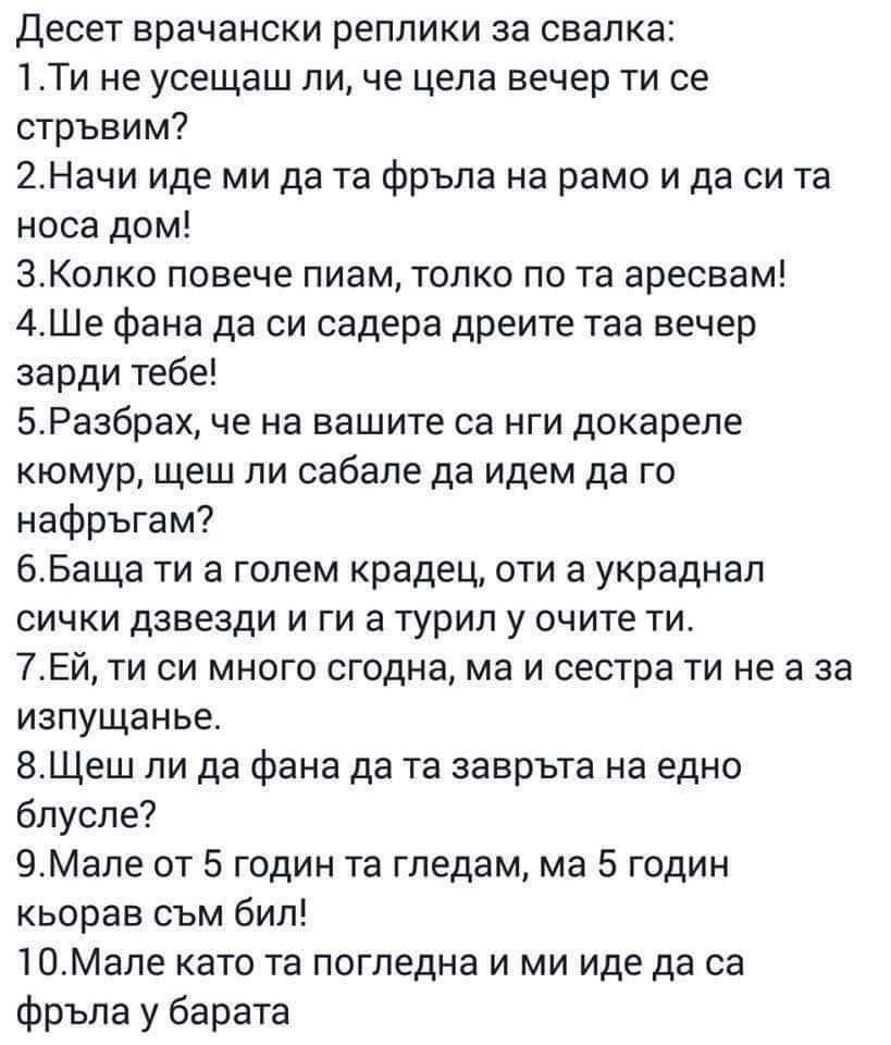 - Във връзка с новите правила за лични данни, нямам право да ви викам по име. Затова, пациента с трипера, моля, заповядайте!