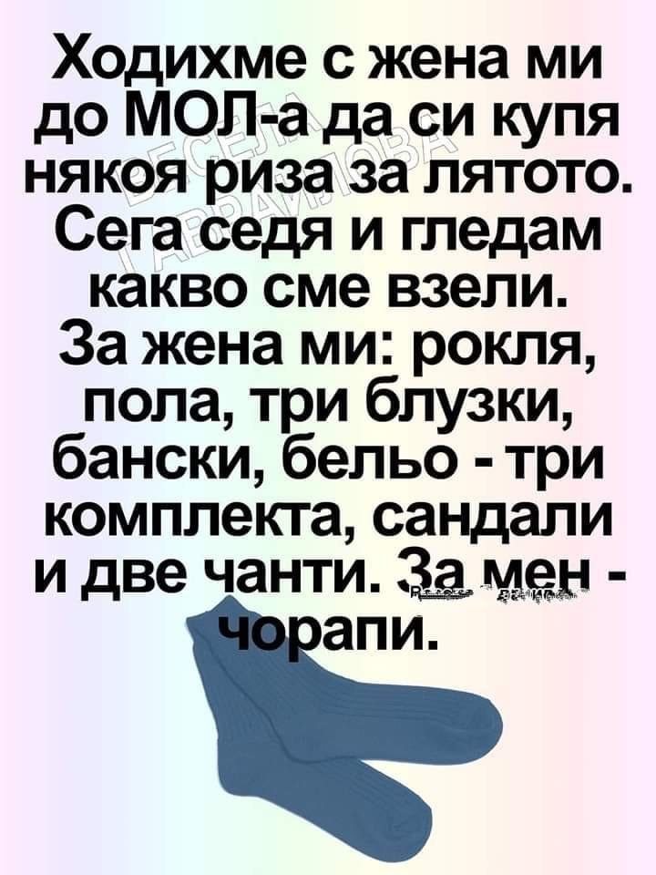 - Ало, Мечо! Днес си купих ботушки от мола. Кафяви, кожени, с катарама! Нали не се сърдиш, мило? Многооо те обичкам!
