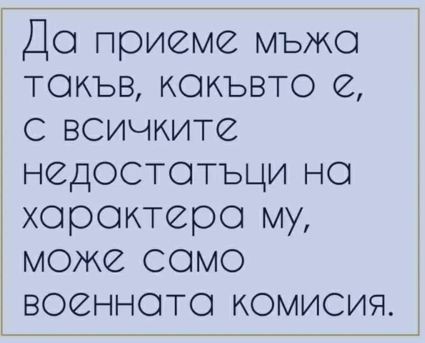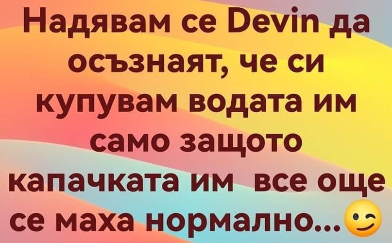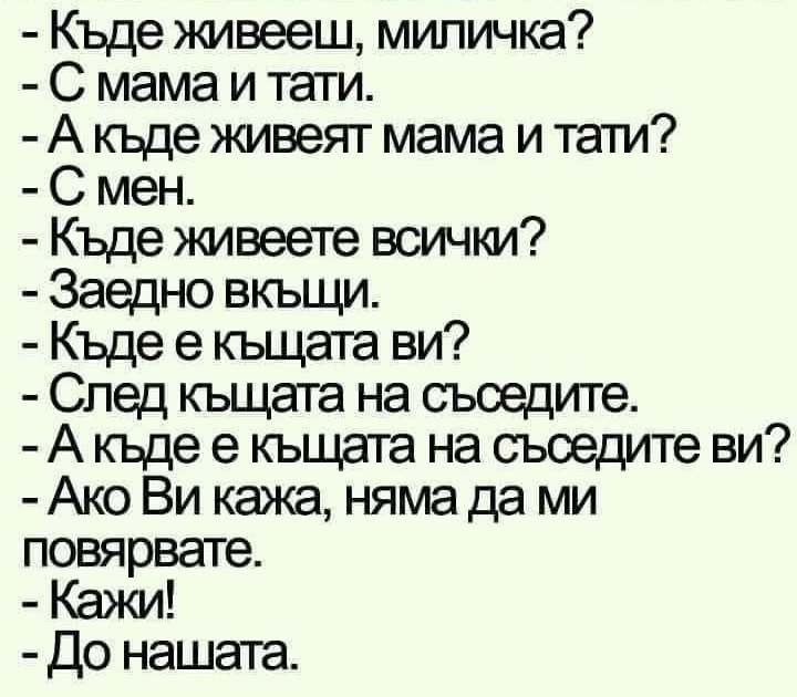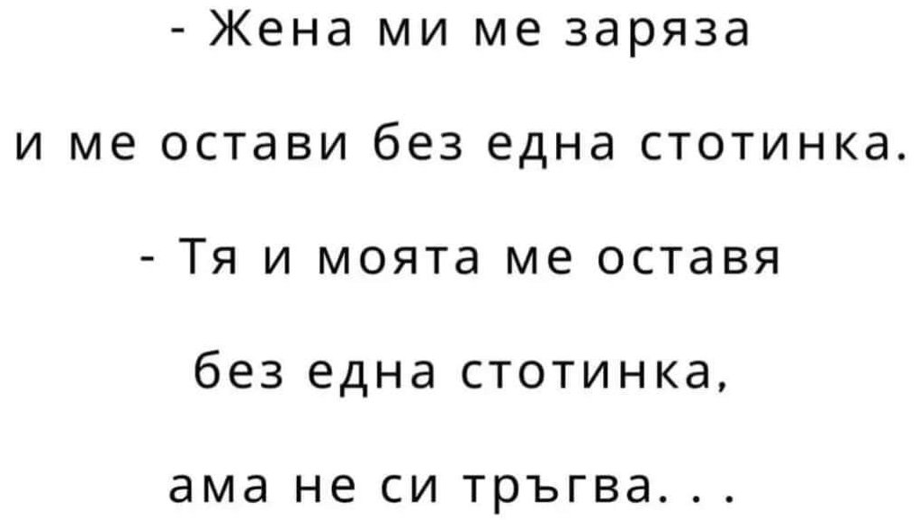 "Бях за няколко дни на вилата с децата, а мъжът ми остана в София, понеже не можеше да си вземе почивни дни. Един път решил да свари супа. В инструкцията пишело: кипнете един литър вода. Всичко ясно, ама как да измери литър? Помогнала му логиката на програмист. Отишъл до магазина и купил две Загорки от 0.5л. А после ги погледнал и казал: Абе за какво ми е супа?"
