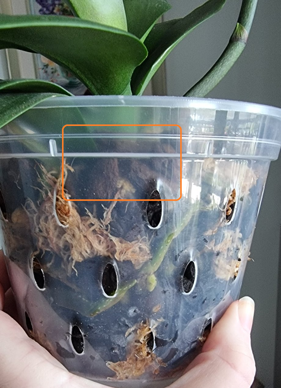 Това е първата ми. Пресадих я преди 2 месеца, сложих и валка сфагнум уж за по-добре. Накисвам я горе долу през 7 дни когато видя, че е сребриста в корените. Саксийката е с дупки ама е баж по размера на кашпата, да не би да се задушава?