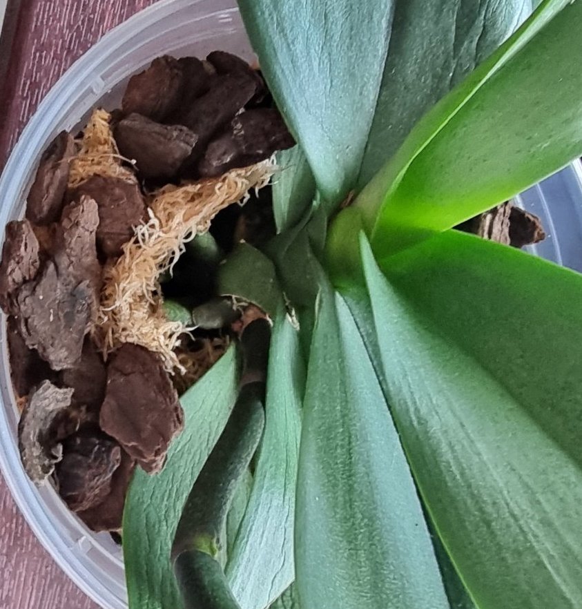 Много е заровена в кори, те трябва да са под нивото на растежа на най-долното листо. Нищо не се вижда от орхидеята нагоре, а и от корените и по едно листо нищо не можем да ти кажем съществено... Извади от кашпата и снимай да се види в саксията как е, как е розетката и нешо от горната част на растението Hands V