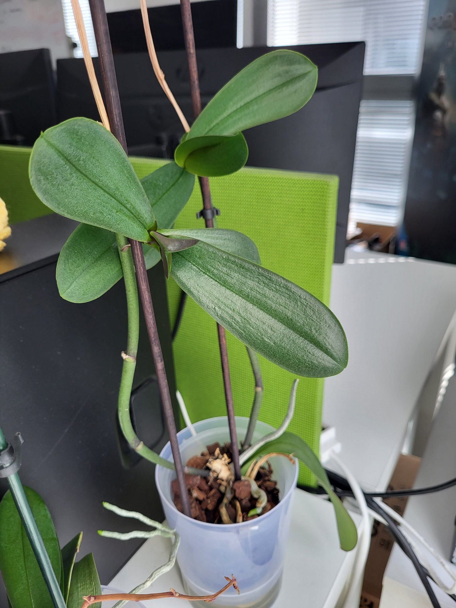 От двете клончета ,които останаха зелени след като опада цвета, тръгнаха две нови листа. Вече имат по няколко и дори пуснаха малки зелени коренчета.