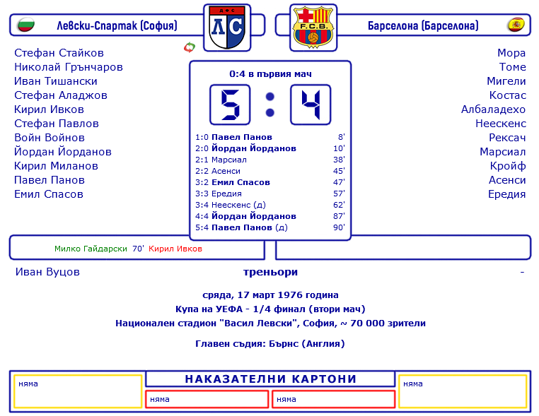 ... а "топспорт" пише: "Редица спекулации сочат, че дори феновете по трибуните в София са били повече от приетите за окончателни. Според някои източници запалянковците са стигнали 71 000, с течение на двубоя, предвид факта, че Левски повежда с 2:0 още до 10-ата минута. Други мнения обаче твърдят, че е имало и срещи на ЦСКА и Славия в Европа, доближаващи се до тази грандиозна цифра."