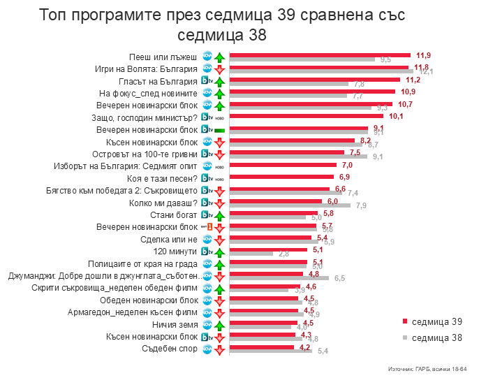 За съжаление bTV продължава да губи позиции и през втората седмица на премиерните си шоута: Бягство към победата 2 и най-вече Островът на 100-те гривни. Да видим дали тази тенденция ще продължи и за третата седмица, която беше интересна и предполага леко покачване на цифрите.