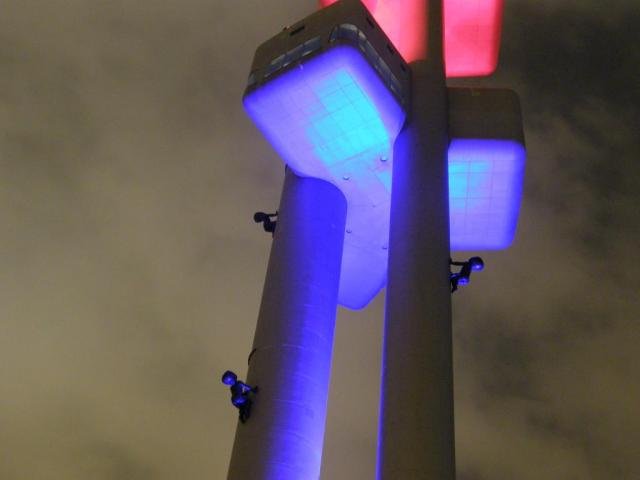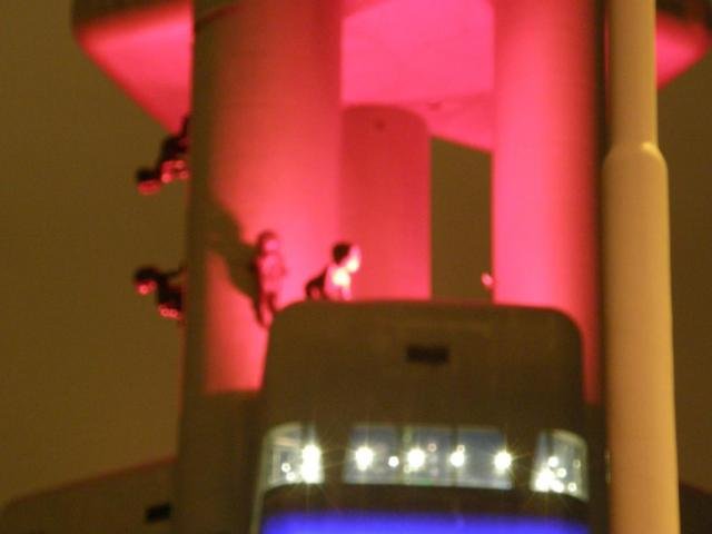 Залите за наблюдение са по-нагоре от ресторанта и кафето. Заведенията са на първата площадка осветена в червено, а наблюдателната е осветена в синьо. Ние се отбихме само за по едно бързо питие в ресторанта, защото отидохме доста късно към 22 и нещо, а  кулата и съотв. заведенията работят до 23 ч. За кафето не съм сигурна дали не е и до по-късно, но то беше пълно