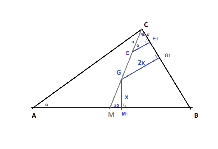 Като изразим лицата АBG=x. AB/2, a на  ВСG e 2x.BC/2,ще получим, че ВС=1/2АВ.т.е. правоъгълния триъгълник е с 30 градуса.