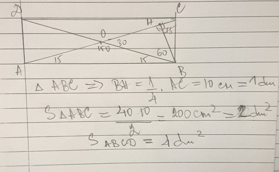 Диагоналите  АС и BD на правоъгълник ABCD  се пресичат в точка О. Ако АС = 40 см и ъгъл АОВ = 150 градуса, то колко квадратни  дециметра е лицето на правоъгълника?