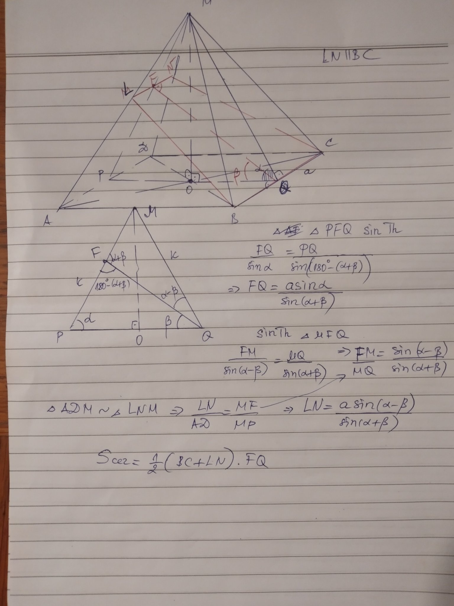 Дадена е правилна четириъгълна пирамида с апотема к и двустенен ъгъл при основата с големина Алфа. През основен ръб на пирамидата е прекарана равнина мю, която образува с равнината на основата ъгъл Бета (бета по-малък от Алфа). Да се намери лицето на сечението на пирамидата с равнината мю.