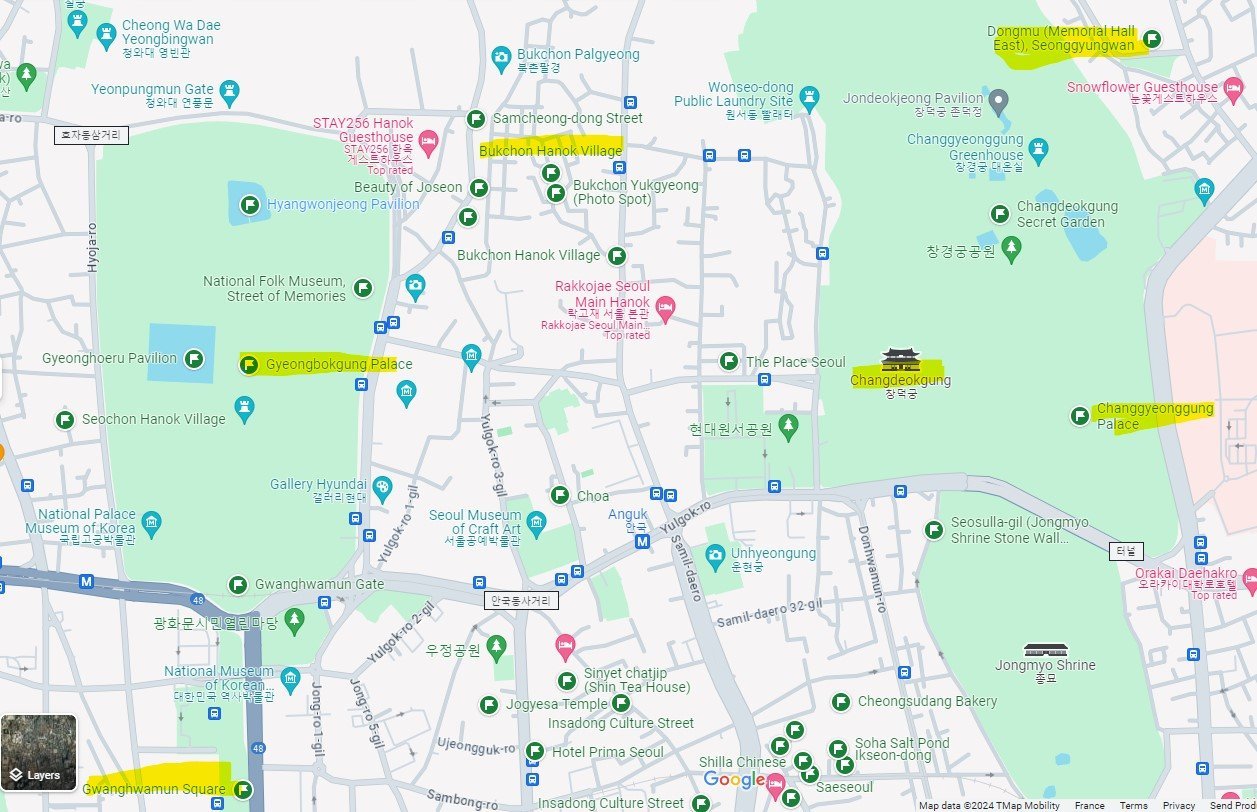 Между двата дворцови комплекса, Gyeongbokgung и Changdeokgung се намира селището/кварталът Bukchon, където има доста запазени традиционни къщи (ханок). Навремето в тях са живеели дворцовите велможи, министри и други сиви кардинали, които сме виждали в сериалите. А на североизток, близо до Changdeokgung се намира и университетът Seonggyungwan (също често споменаван в сериалите, където виждаме конфуцианските учени).