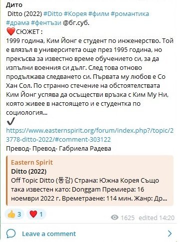В случай, че някой иска да гледа филма с ХеЮн, шефчето от Минкиния сериал и Йоги уточнявам, че задължително годината се изписва в скоби. За малко да го гледам на руски с наличен бг превод. В последния момент нещо ме накара да пробвам и със скобички т.е. в търсачката се пише Дито (2022). Тъкмо имам време до Феята на щангите да го изгледам.