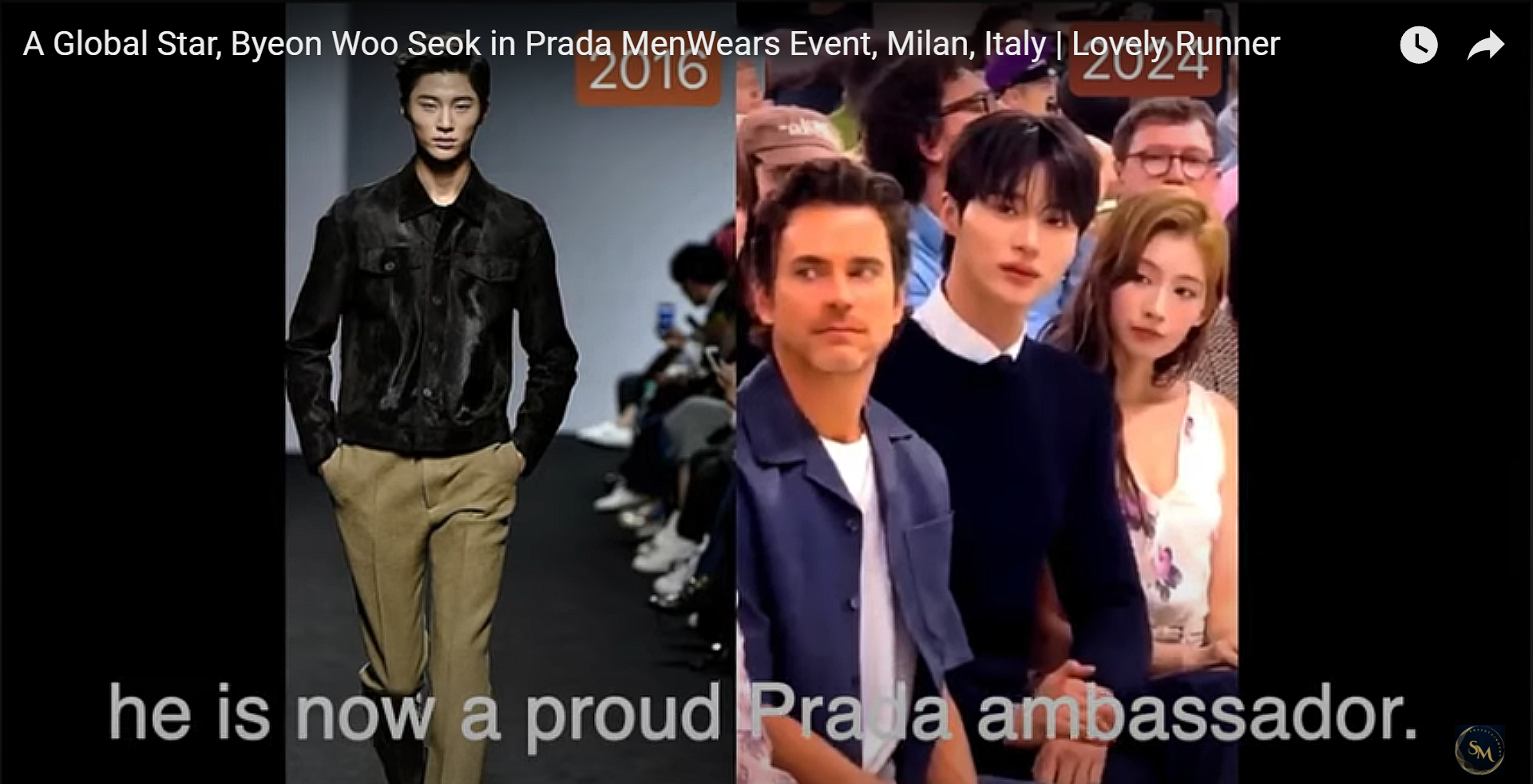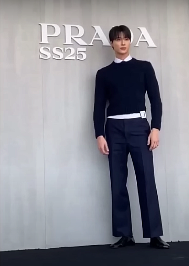 Бьон У Сок на седмица на модата, ревю на Прада в Милано. Видях го и седнал на първия ред, а поканата за първия ред в тези среди е изключително важна и показва статута на този който я е получил, неговия вече е явно много висок. От бюфета за почерпка си взе сандвич и кола, а после изпи и още нещо...