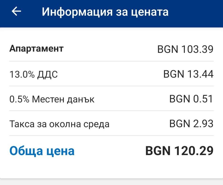 По принцип в общата цена, която сме платили през букинг има включени € 10 government tax per night   и