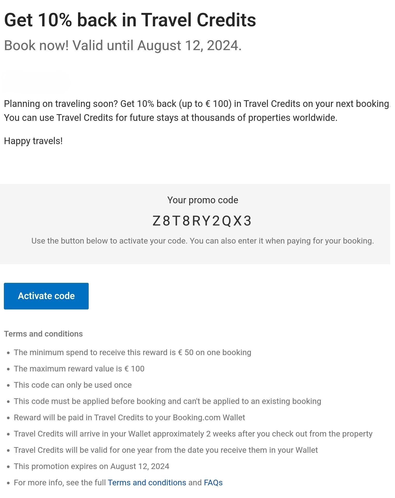 Кодовете за отстъпка на Booking предоставят възможност за намаление на крайната цена на резервацията. При успешно завършване на резервацията, стойността на отстъпката се връща под формата на кредити, които могат да бъдат използвани за бъдещи резервации в рамките на срока им на валидност. Необходимо е кодът да бъде въведен по време на процеса на плащане. След използване на промоционален код, при промяна или отмяна и нова резервация, кодът остава валиден, ако се използва същата резервация. При отказване и нова резервация обаче кодът не се запазва. Потребителите също съобщават, че при анулиране кодът може да се използва за нова резервация в рамките на определен период от време.