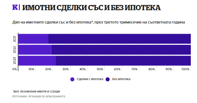 Официално делът на покупките с ипотечен заем в страната е около 20%, но при апартаментите и къщите достига 40%