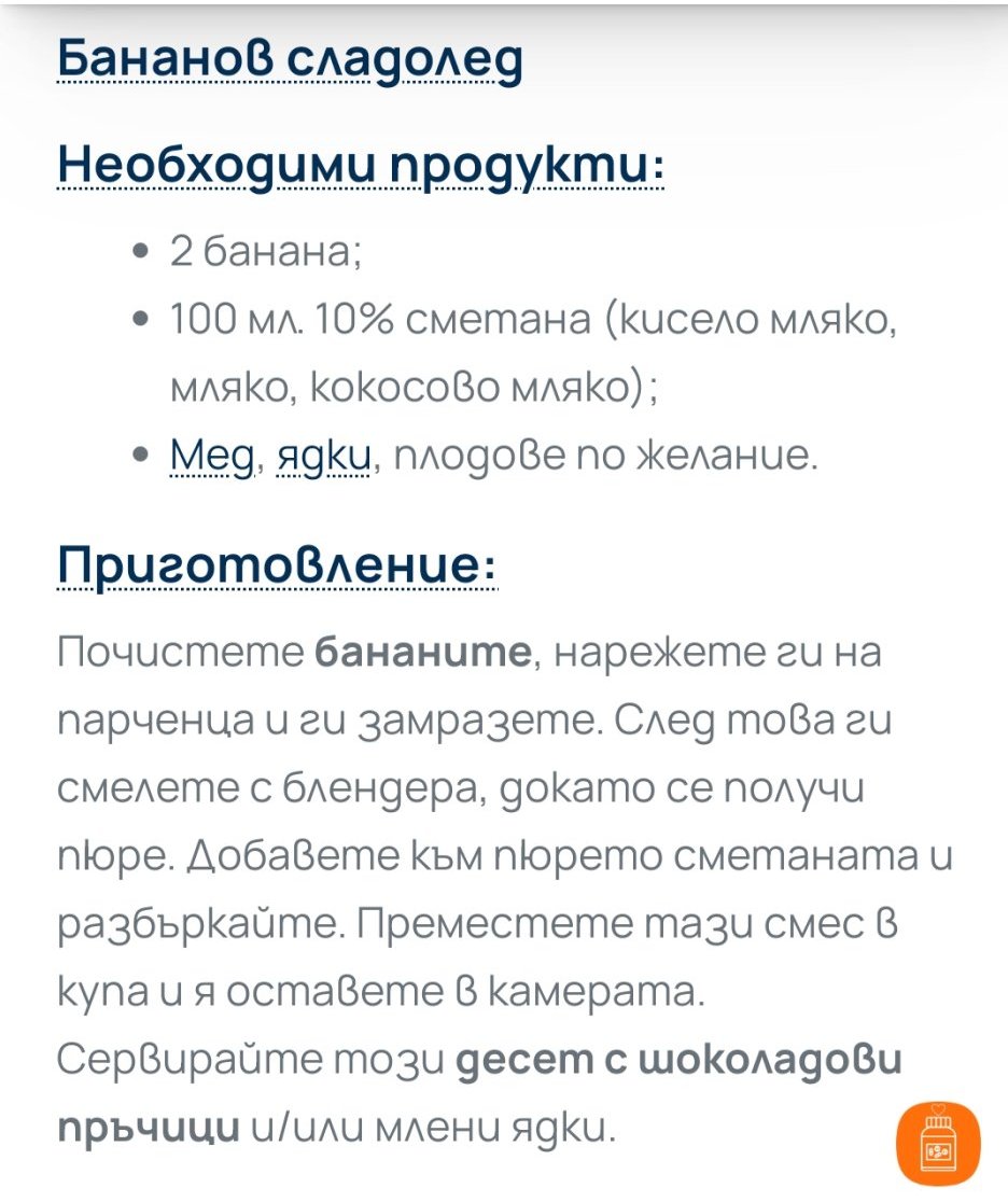 Ние обичаме сорбе и просто вземам замразени плодове (ягоди, малини), добавям малко незамръзнал банан (иначе вкусът се променя), малко мед, разбивам в блендера и го ядем веднага.