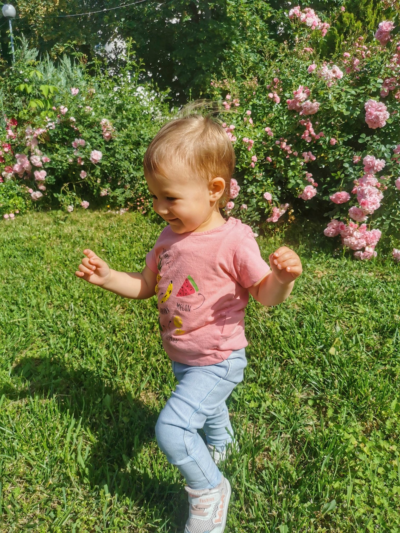 Големият ми син спортува по лостовете навън. Малкият обича да тича и се състезава с други деца, когато са навън. А дъщеря ми е по земната гимнастика и прави всякакви стойки по тревата и на асфалтовите алеи в парка. Малките обичат плодове и в движение хапват различни видове. Обичат също Данонино и мечета Барни. 🙂
