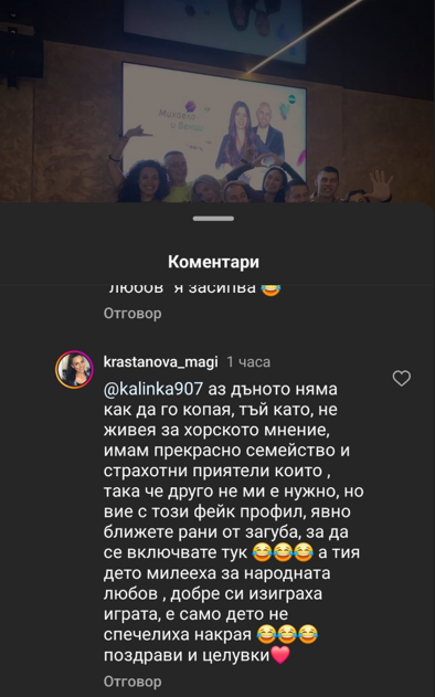 Радвам се, че победиха Мишето и Венци. За тях бях от ден 1. Харесвам ги и не ме интересува, че приятелите им са диви селяндури, визирам Маргото и Йоана. С никой не бих била приятелка в реалния живот, не искам и да ги познавам. Познавам само Светльо и в предаването се показа точно такъв, какъвто е. За мен финала беше честен от гледна точка на игрите. Поне нямаше кражба на огромна сума пари от друга двойка, както беше миналата годна.