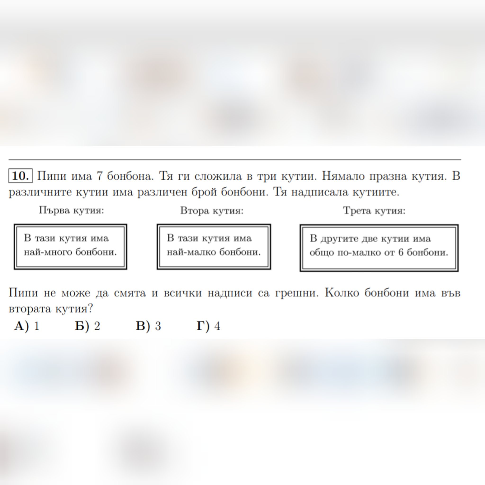 Щом всички надписи са грешни и няма празна кутия, значи в първите 2 кутии има общо 6 бонбона, в третата има 1. Бонбоните са различен брой във всяка кутия (и надписите са грешни), значи в първата са 2, а във втората са 4.