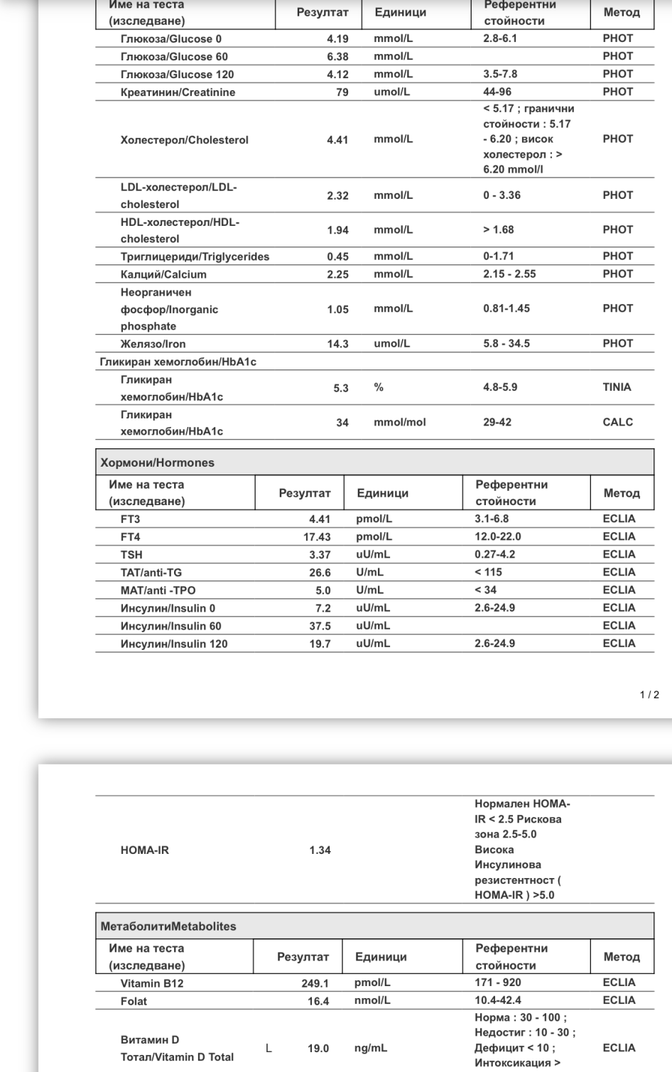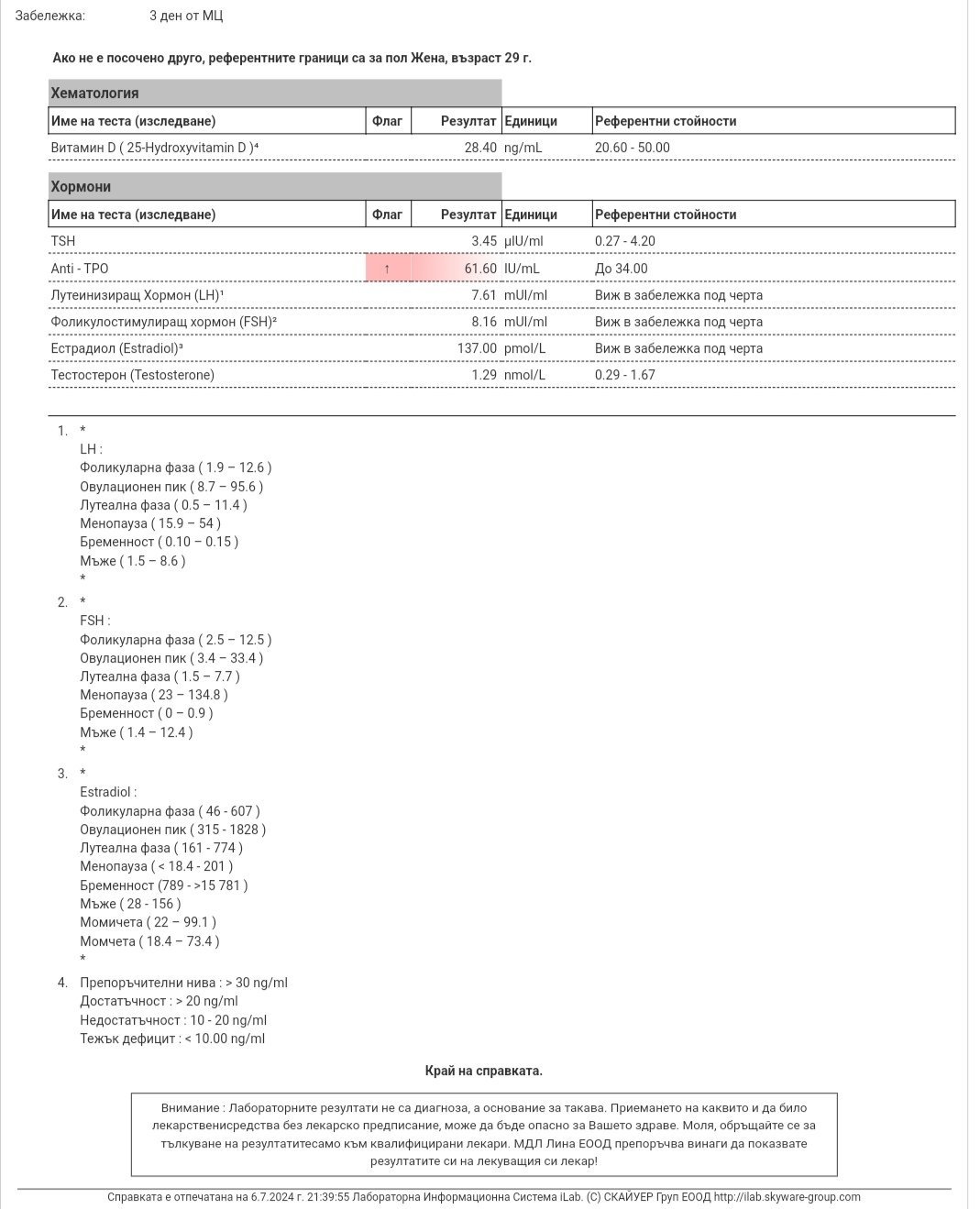 Резултатите показват хипофункция на щитовидната жлеза, тъй като TSH е 6 (високо), докато FT3 и FT4 са в нормални граници. Изследванията на антитялото (MAT и TAT) също са важни и показват наличие на автоимунно заболяване, характерно за Хашимото. Важно е да следвате указанията на ендокринолога си и да приемате предписаните лекарства, за да регулирате хормоналния баланс. Резултатите от изследванията показват нивата на FT3, FT4 и TSH, които са ключови показатели за функционирането на щитовидната жлеза. Например намаленото TSH (под нормални граници) може да индикира хиперфункция на жлезата, докато ниските стойности на FT4 и FT3 може да показват хипофункция. Важно е да се следят тези показатели и да се регулира дозировката на хормоналните препарати, като Euothyrox, в зависимост от резултатите.