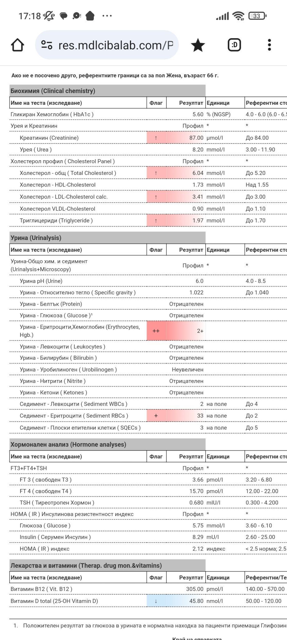 Да, в хипофункция е, но с това тсх никой няма да й изпише хормон. Трябва да навакса витамините преди да започне хормон. Единствената възможност е сама да се дозира. На фона на останалите резултати обаче, щитовидната не й е на преден план. Много лош холестеролен профил, бъбреците са обременени, кръв в урината. На първо време търсете специалист за бъбреците, да оправи креатинина, за да не направи недостатъчност. После холестеролния профил и накрая щитовидната. Трябва хранителен режим, но лекар да се ангажира да назначи. През това време да наваксва витамините и може да не се наложи т4. Тази хипофункция дори може да е във връзка с проблема с бъбреците.