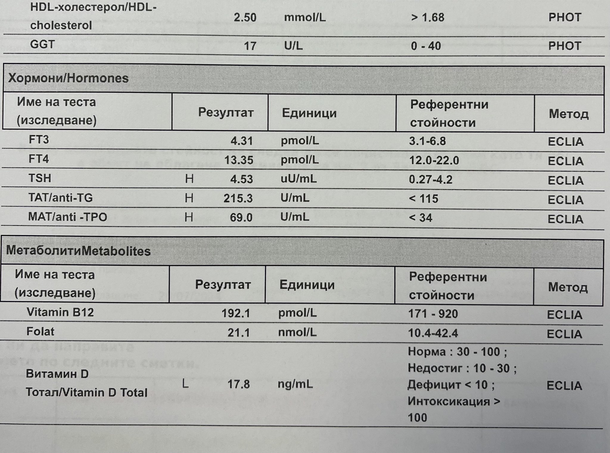 Здравейте и от мен. Попрочетох от темата. Бях на ендокринолог миналата свдмица и според докторката има малки съмнения за Хашимото. Пуснах изследвания и днес излезнаха, Но съм на доктор чак след 2 седмици(отпускарски сезон), а ме притесниха. Чудя се дали да търся някой в Хейли да ми ги разчете,  но реших да попитам и тук за съдействие.
